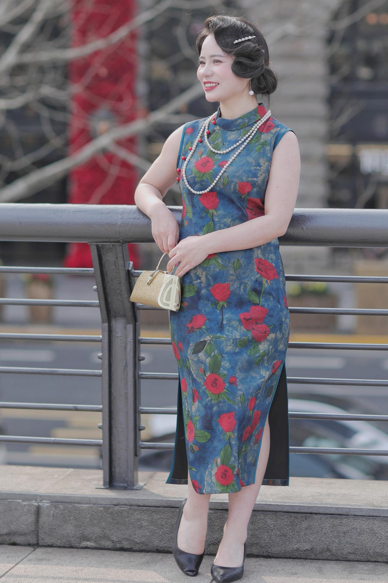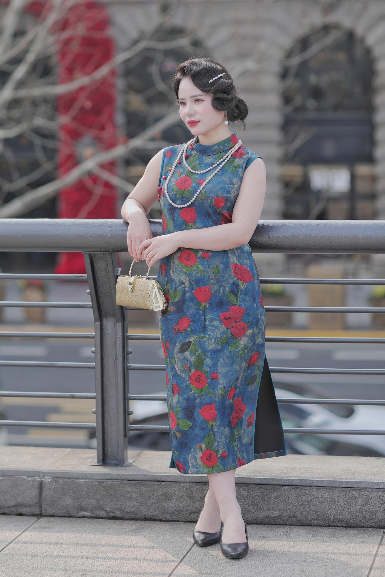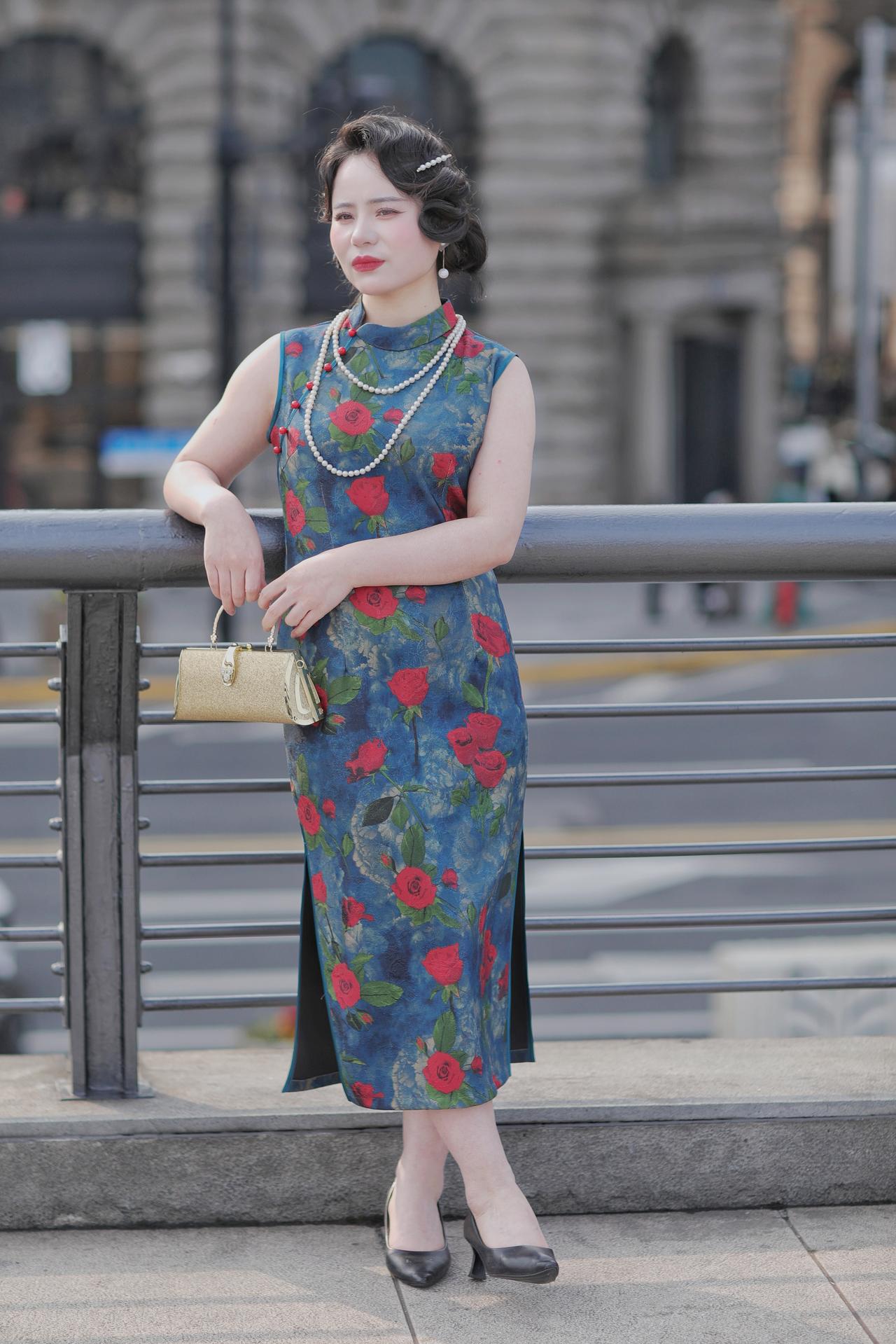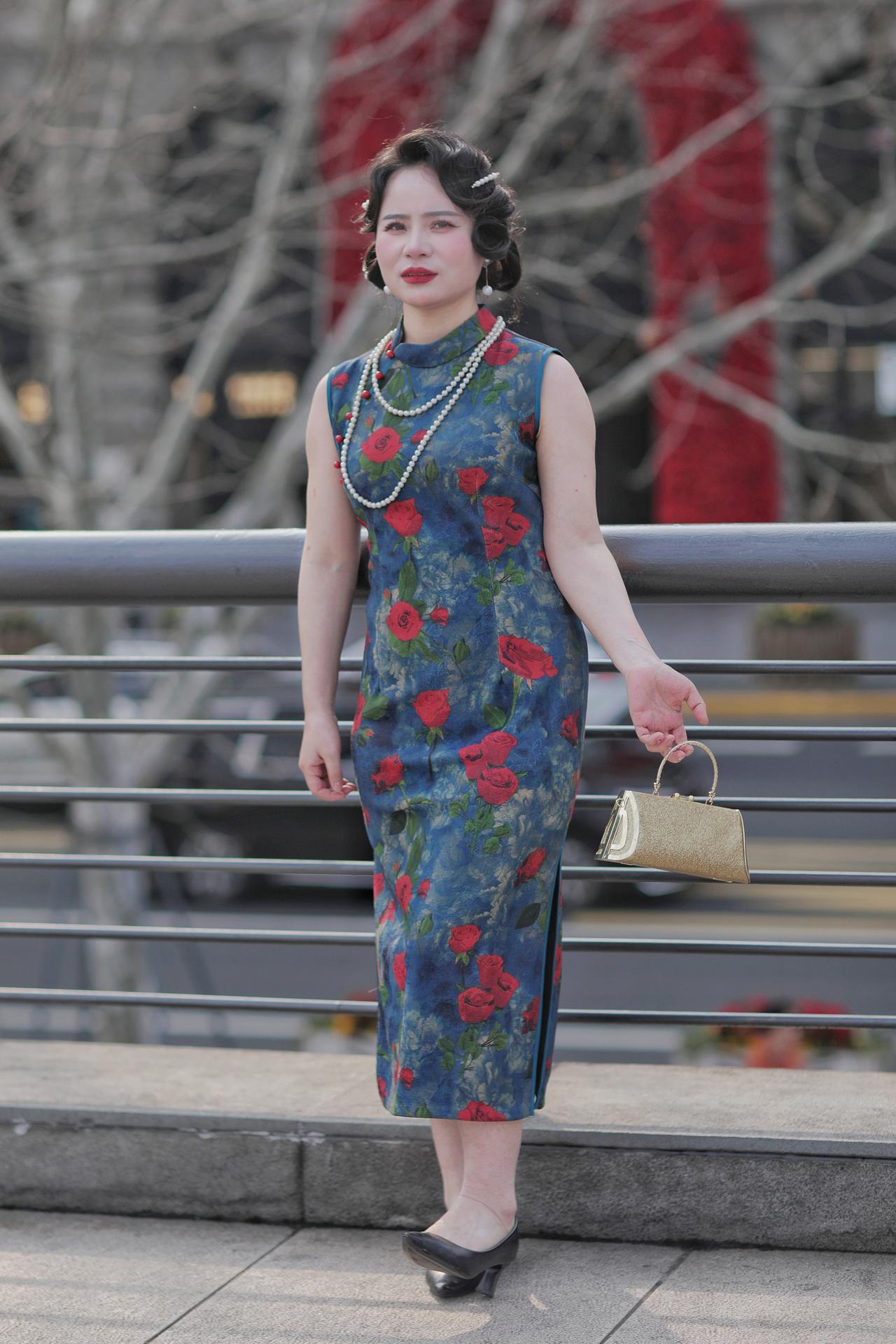 一袭藏蓝暗纹旗袍勾勒出民国女子的绰约风姿。珍珠领饰衬得脖颈纤细,白边盘扣沿襟而下,暗纹在光影里若隐若现,复古卷发别着珍珠发簪,红唇似火,眼波流转间尽是老上海的风情万种。她执一柄素竹折扇,倚着红砖街角,一步踏在石阶上,旗袍开衩处露着纤细脚踝,黑布鞋踩出岁月的温柔。风拂过发梢,仿佛穿越回十里洋场,将旧时代的优雅与妩媚,定格成一帧永不褪色的老照片,每一寸线条都写满了东方女性的温婉与风情。