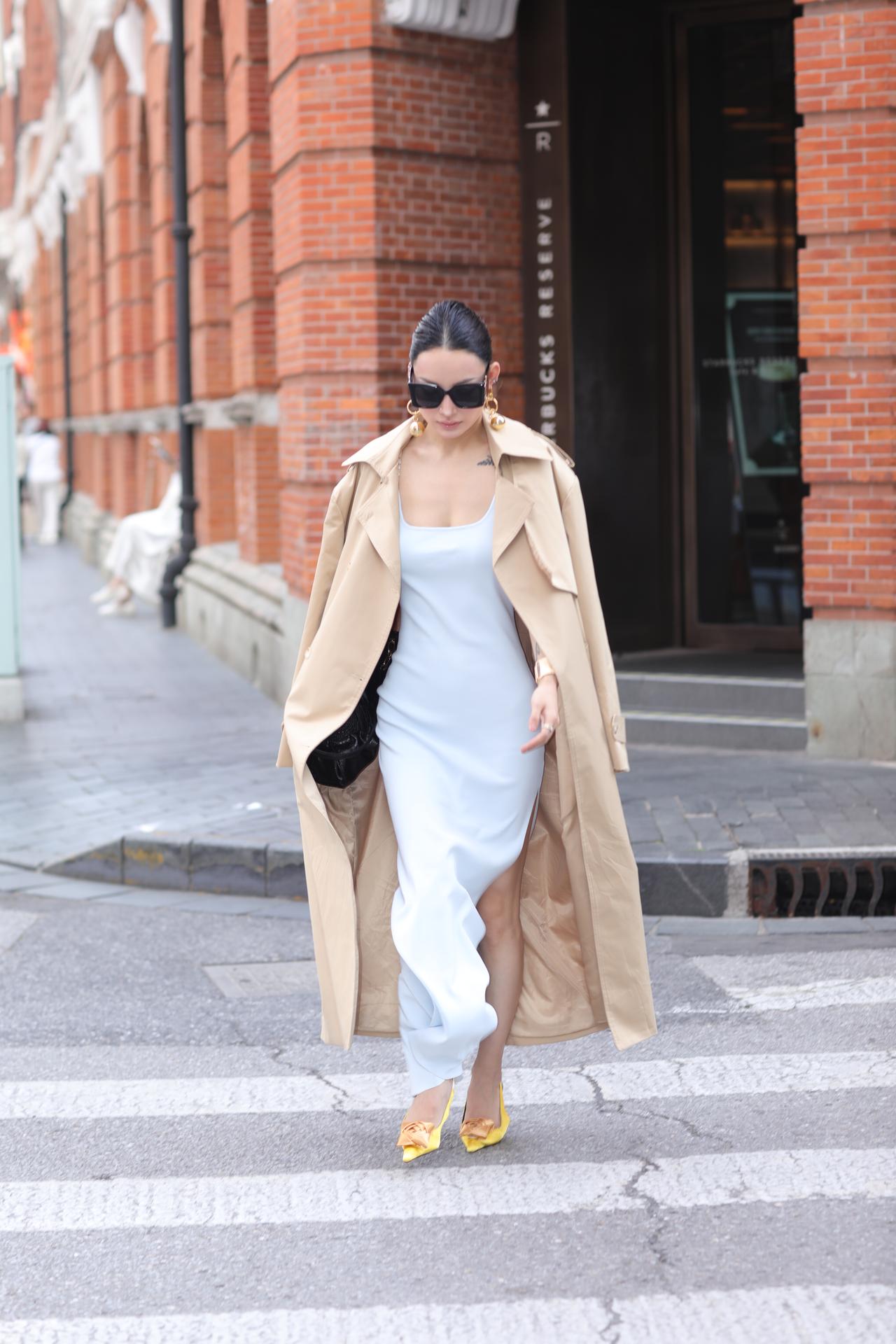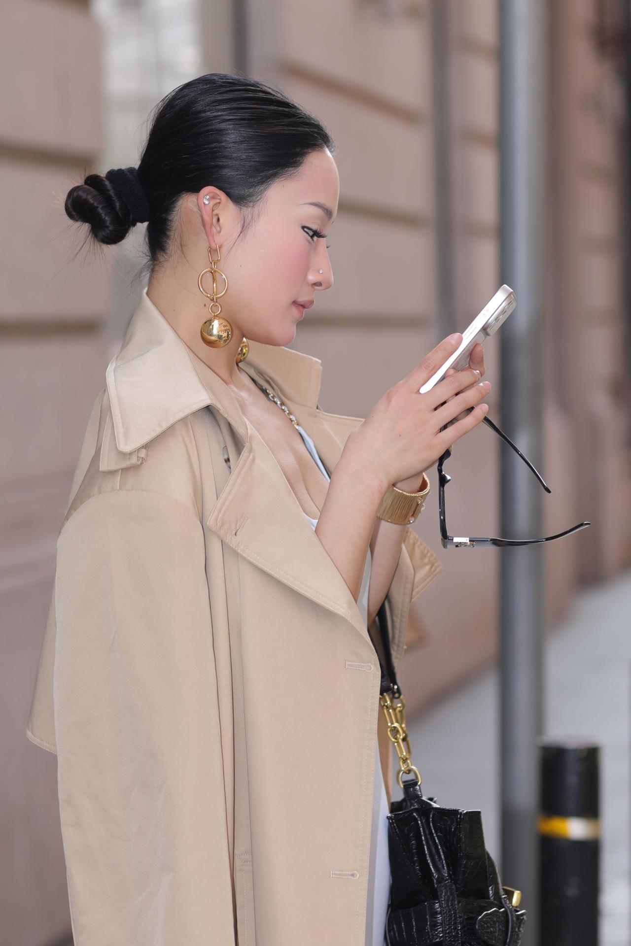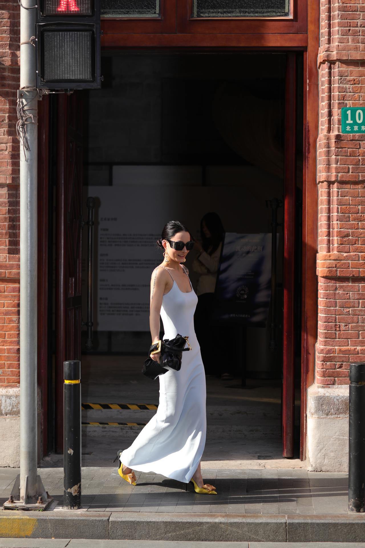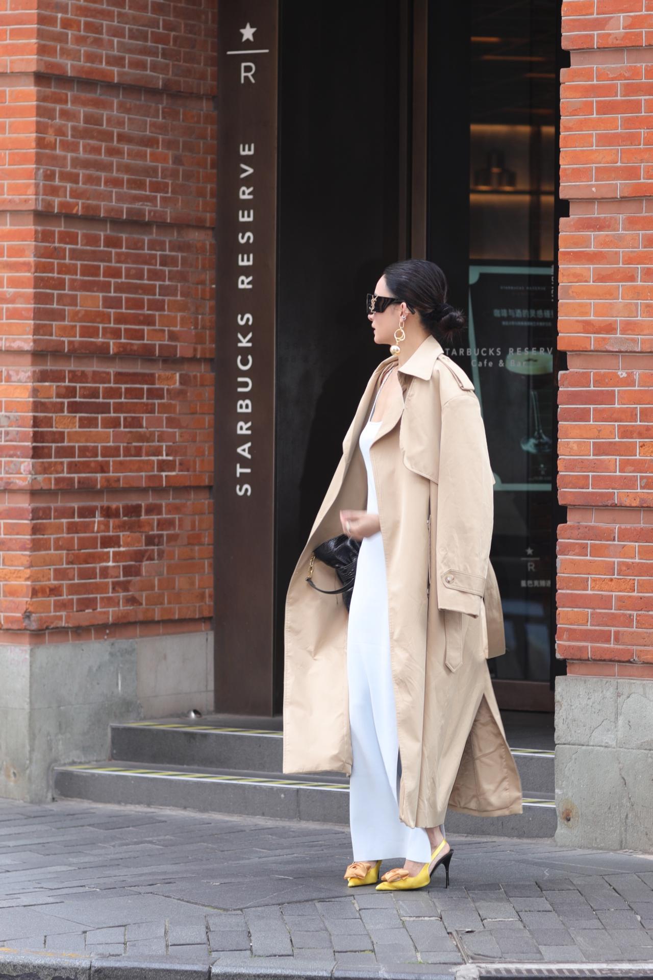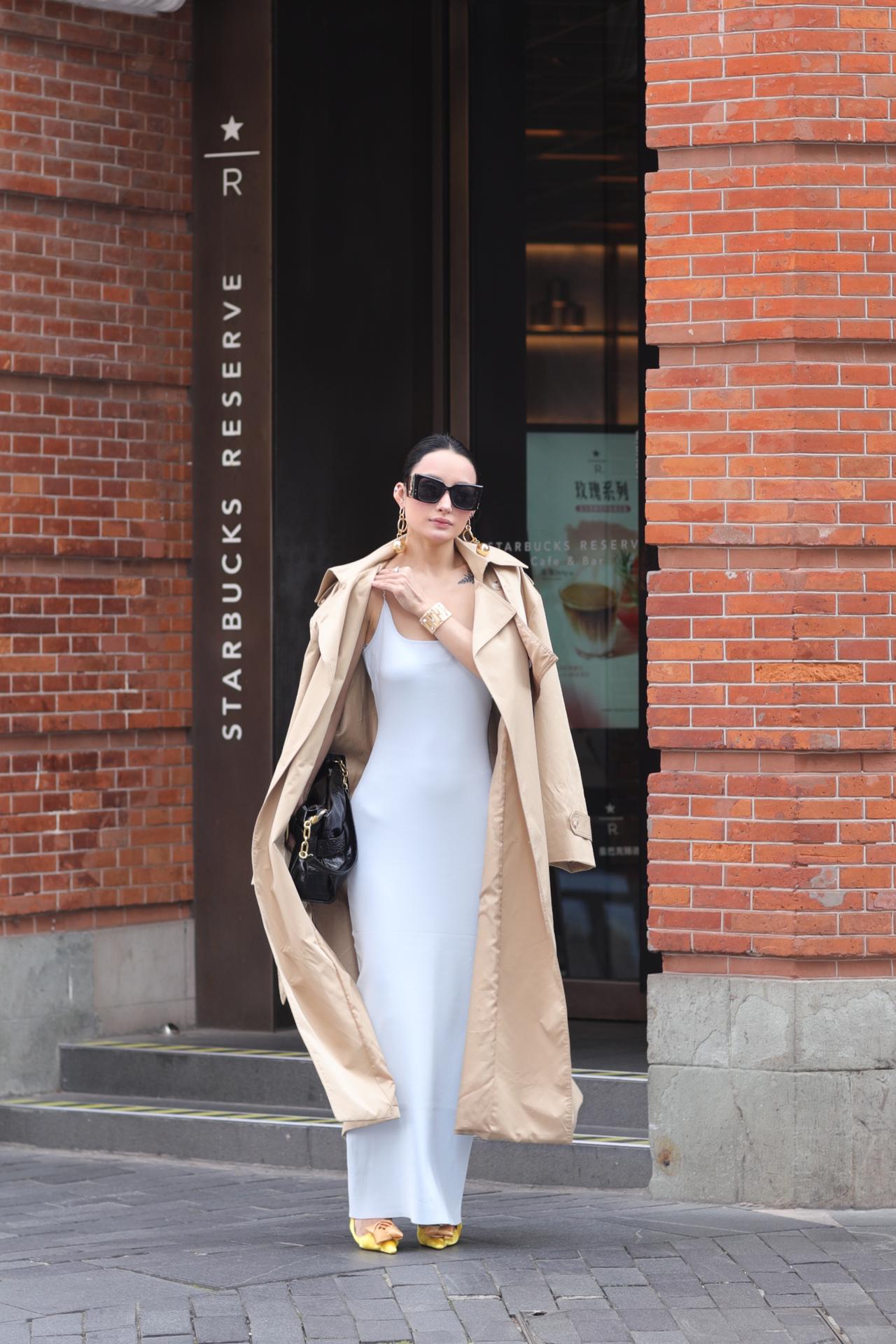 都市女郎以一身松弛又精致的穿搭,演绎出春日街头的高级氛围感。浅冰蓝缎面吊带裙勾勒出流畅的身体线条,开衩设计随步伐轻晃,藏着恰到好处的性感;卡其色风衣随性披在肩头,为柔媚造型注入利落气场,一柔一刚碰撞出时髦张力。亮黄色蝴蝶结高跟鞋成为点睛之笔,在灰调街景里撞出鲜活亮色,墨镜与金饰更添几分冷艳气场。她漫步在老上海的烟火与摩登之间,复古红砖与现代穿搭相映成趣,每一步都像是行走的时尚画报,将都市女性的自信、优雅与松弛感,完美定格在春日街头。