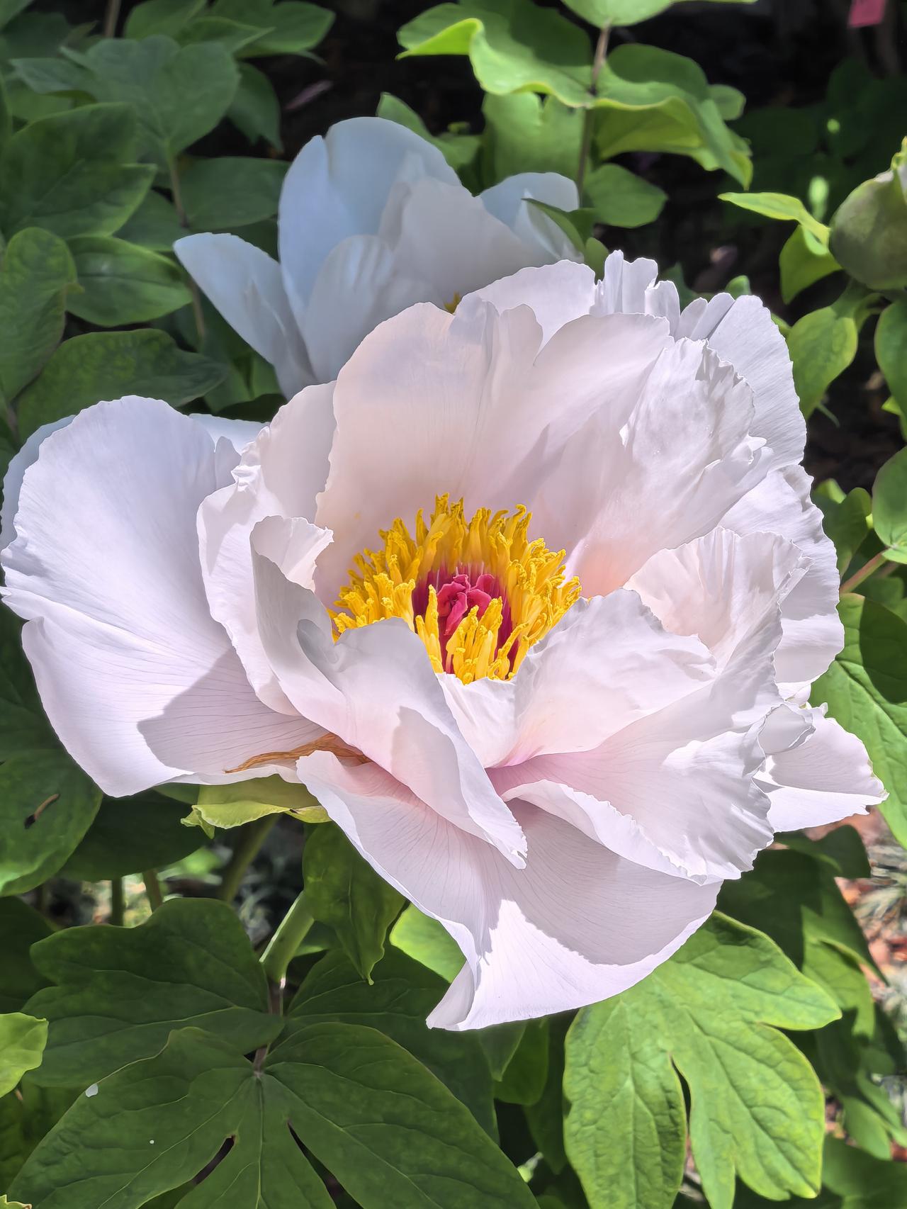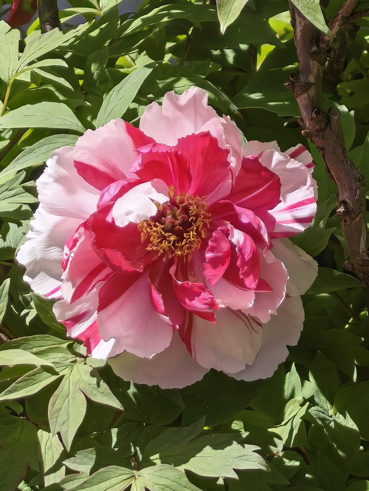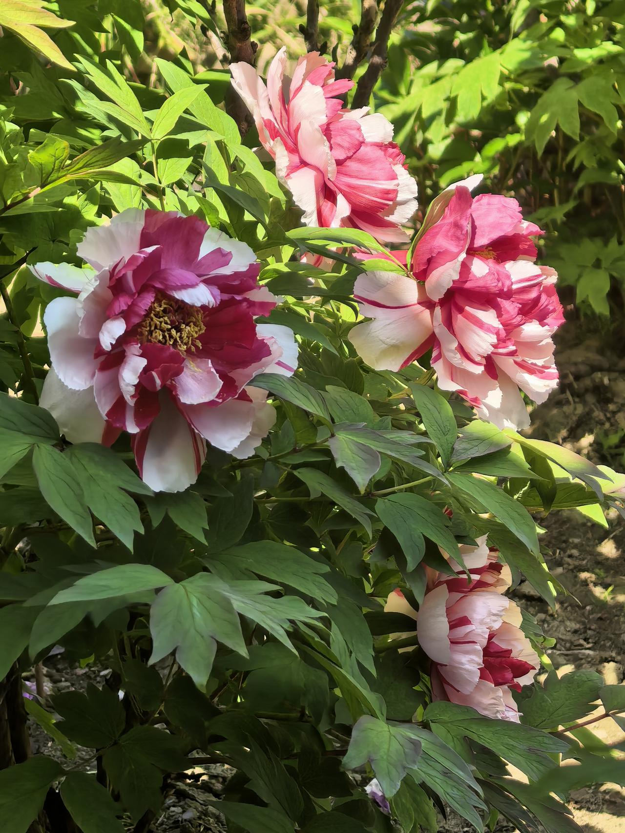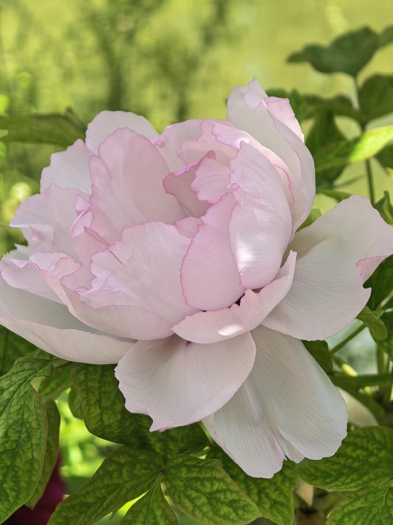 花瓣层层叠叠,边缘晕着柔润的白,花心晕染着温柔的粉,像被春日阳光晕开的胭脂,在绿叶间舒展着雍容的姿态。嫩黄的花蕊藏在层层花瓣深处,在阳光下闪着细碎的光,引得风都放慢了脚步。翠绿的叶片托着饱满的花团,在光影里漾着生机,将春日的明媚与华贵尽数藏进这一方庭院。每一朵都开得肆意又端庄,既有盛放的热烈,又有牡丹独有的典雅,把“唯有牡丹真国色”的诗意,开成了眼前最鲜活的风景。