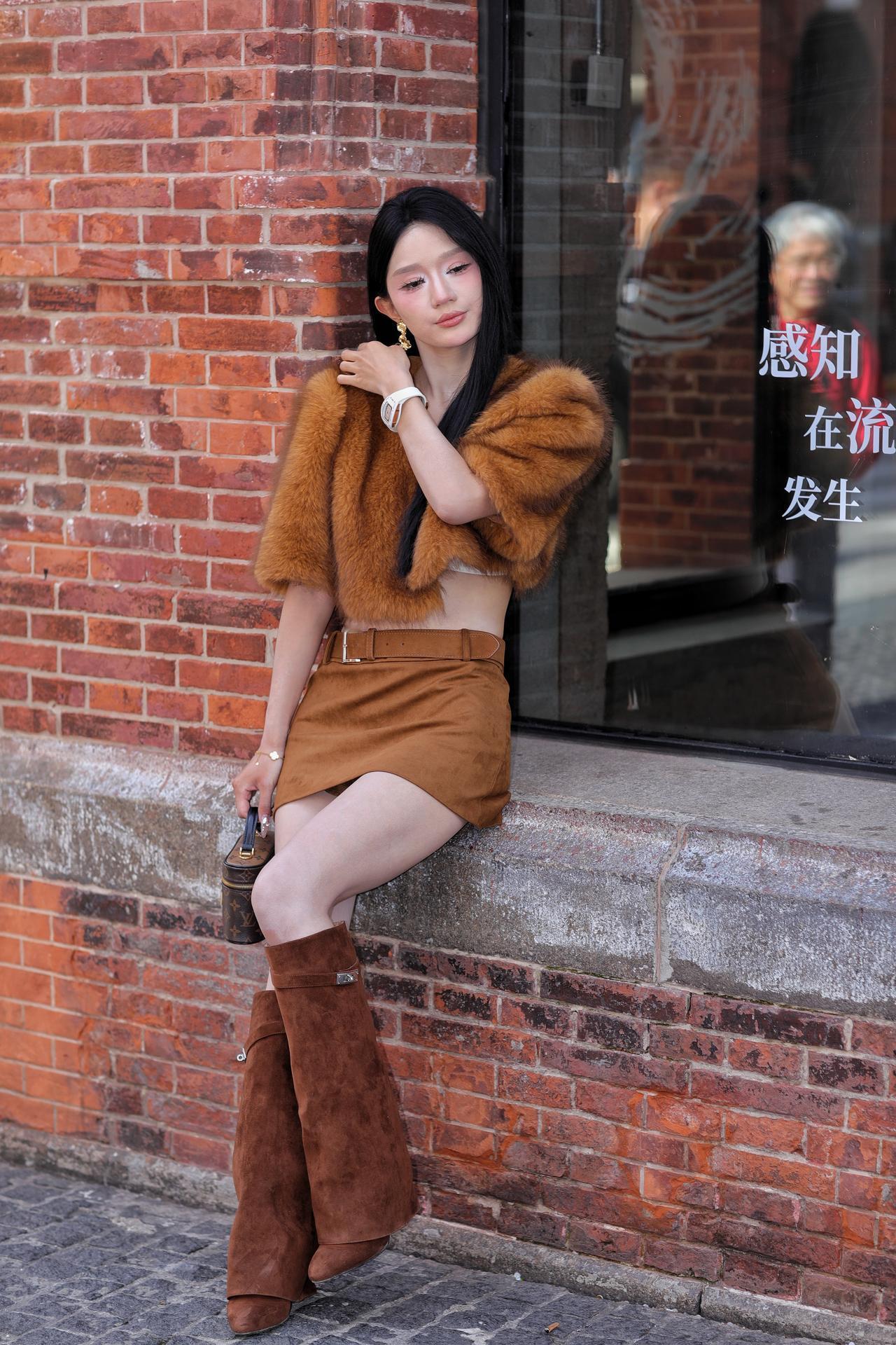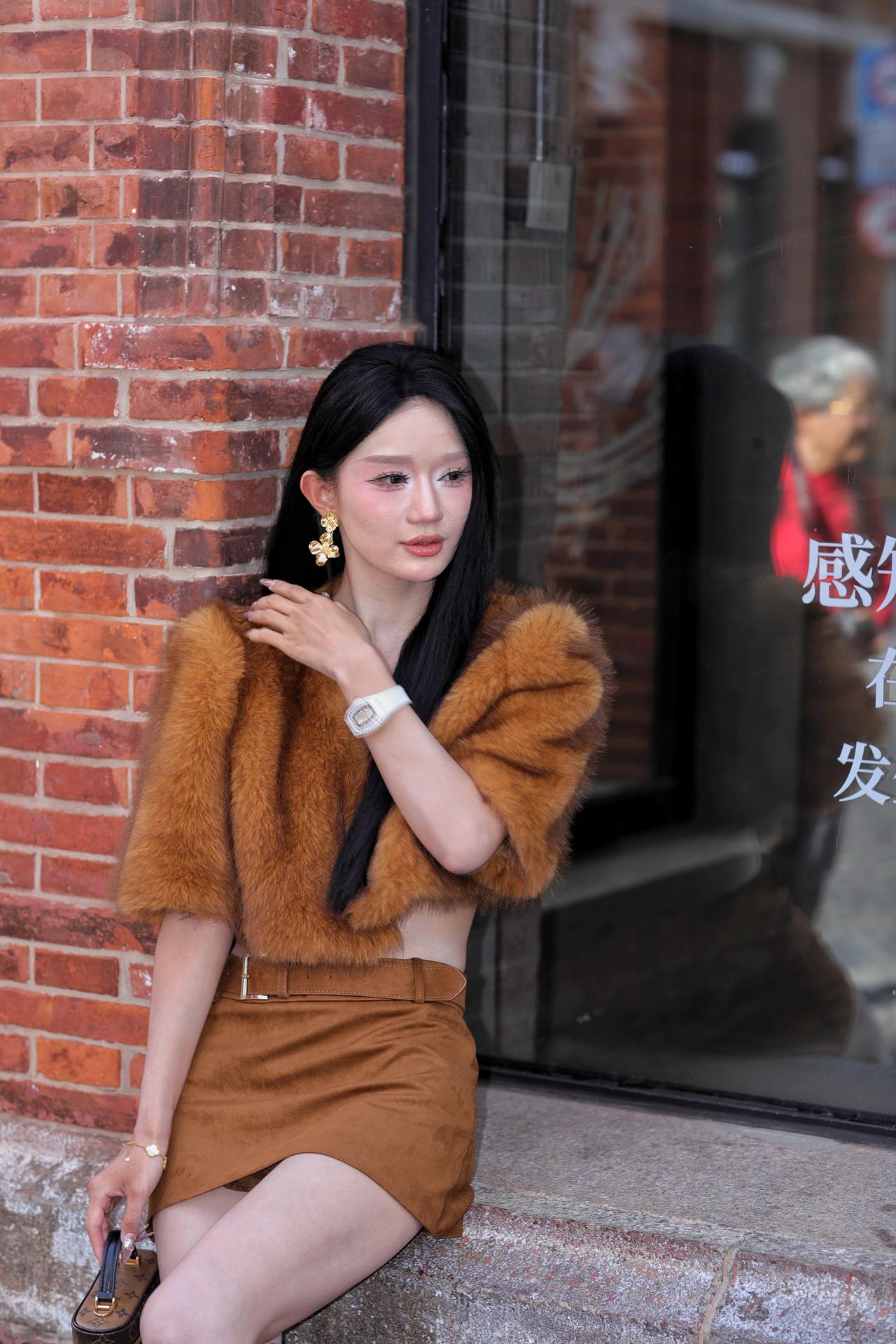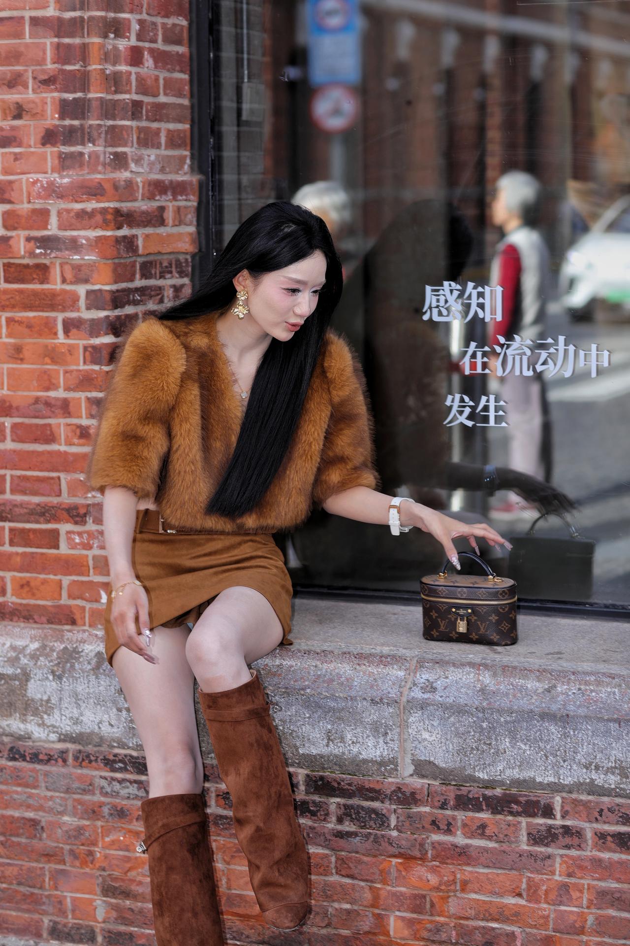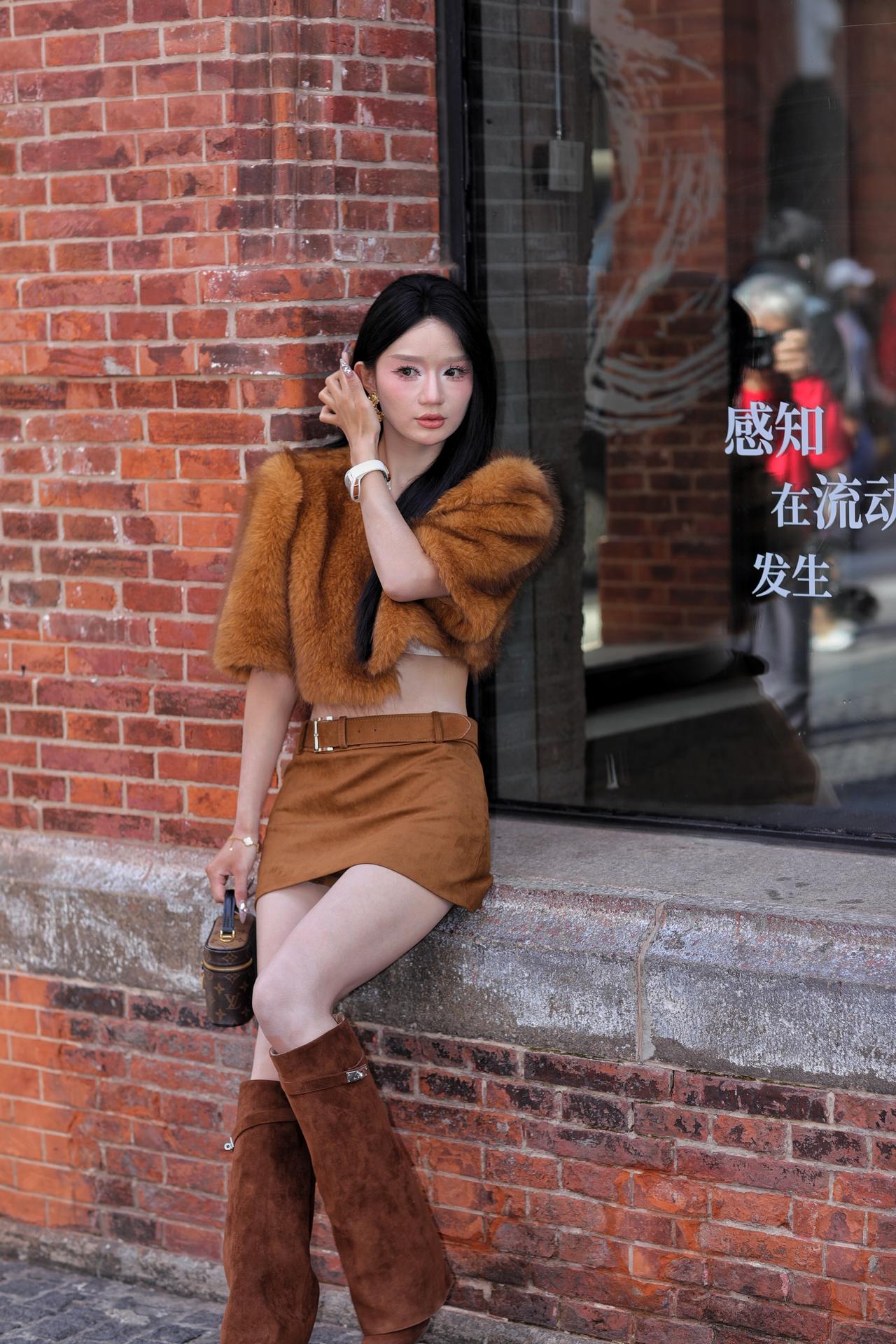 暖棕皮草裹挟着秋日的慵懒贵气,短款设计利落露腰,勾勒出玲珑腰线,同色系麂皮短裙与高筒靴形成完美呼应,整套造型在复古红砖墙前,晕染出浓郁的美式复古氛围。黑长直发丝柔顺垂落,金饰耳坠与白镯点缀细节,慵懒倚靠的姿态、松弛的神情,将都市女郎的精致与随性完美融合。