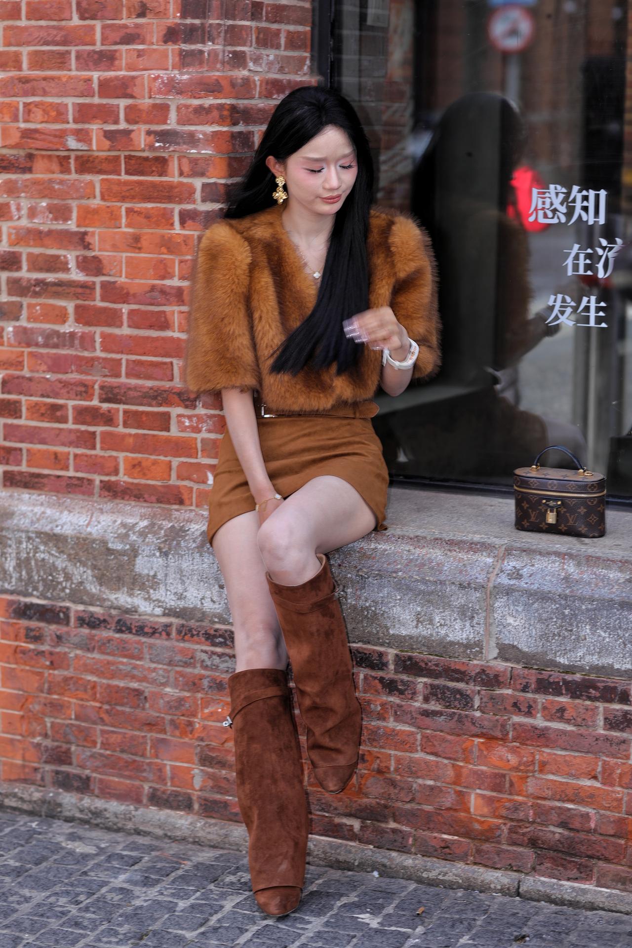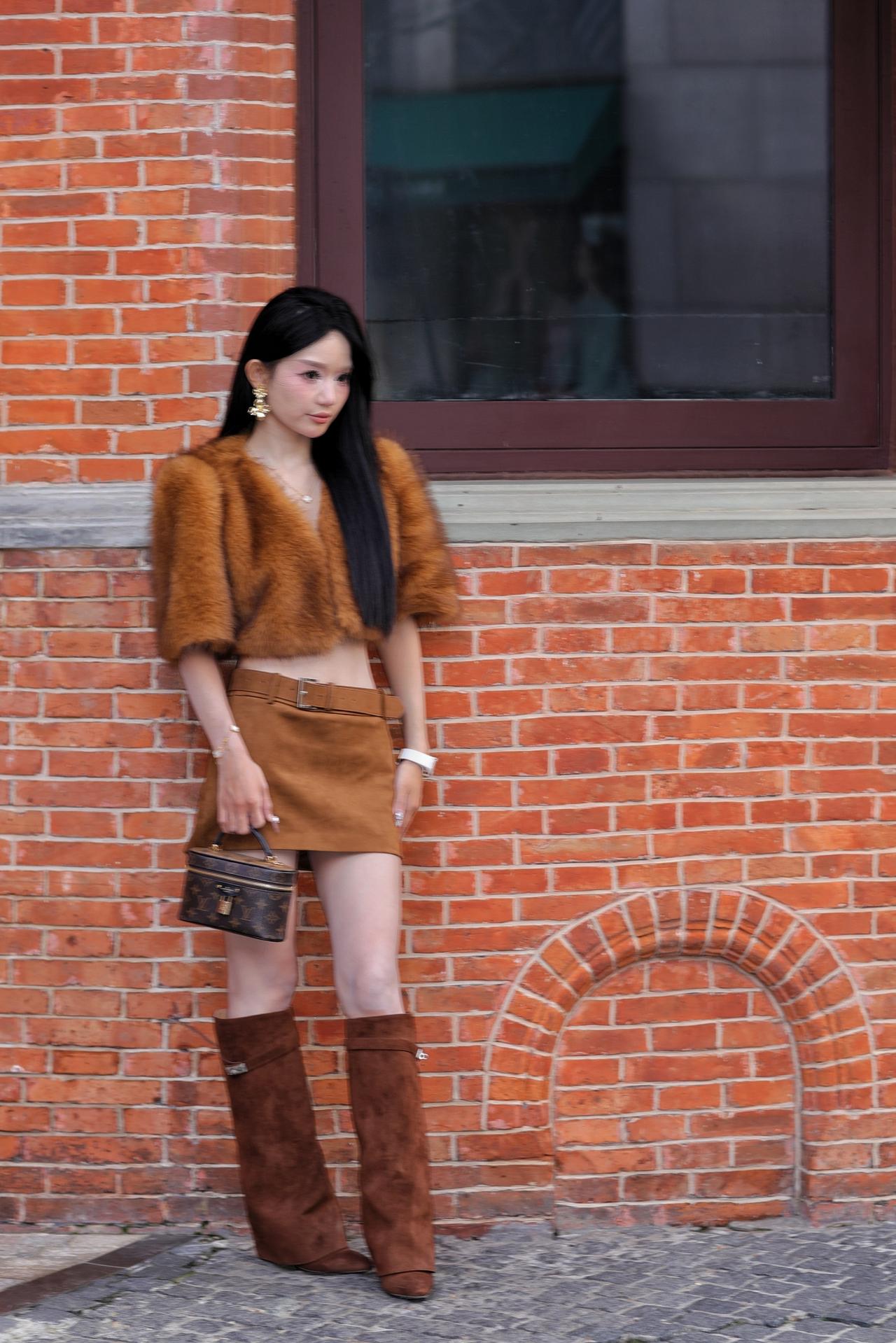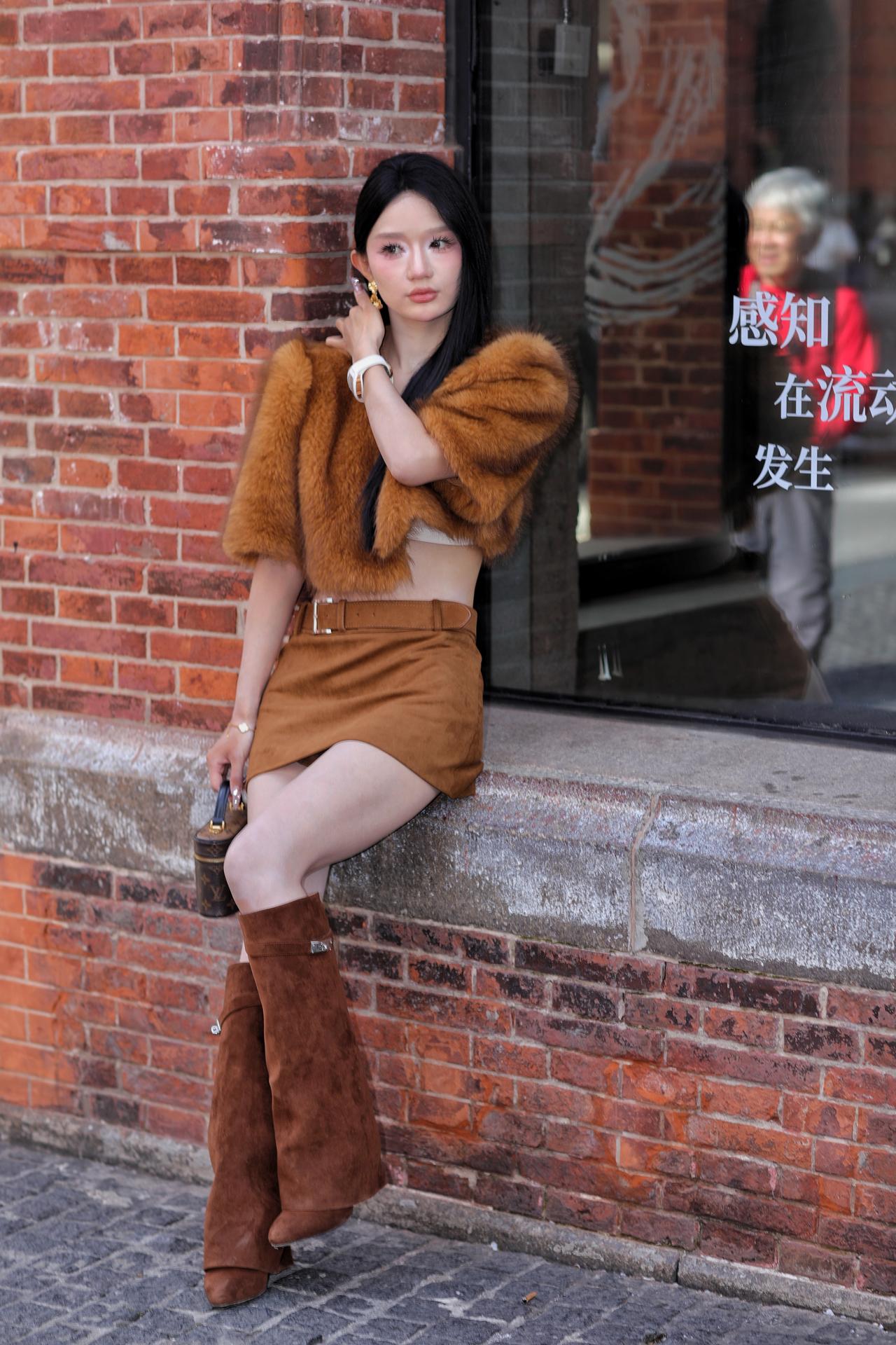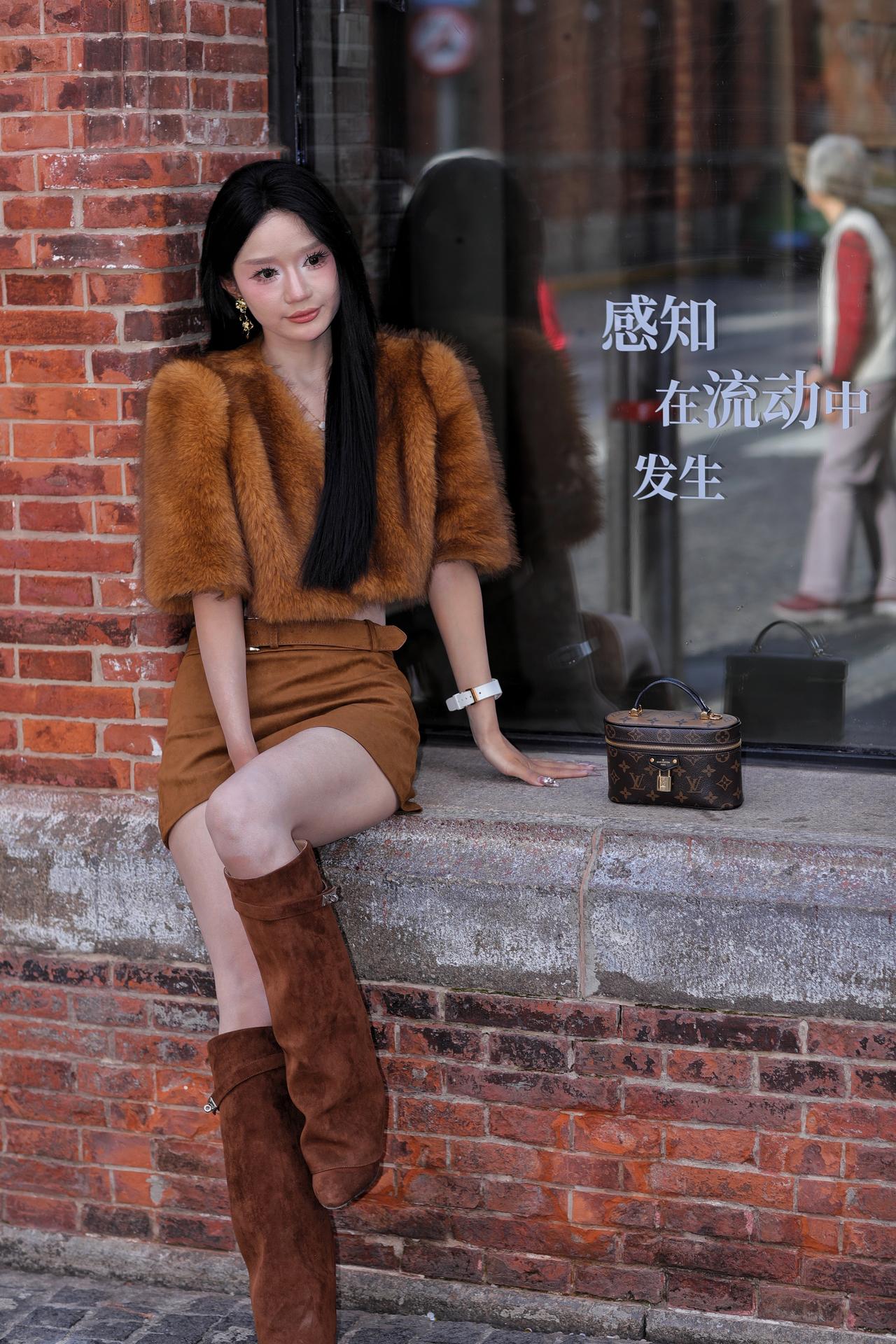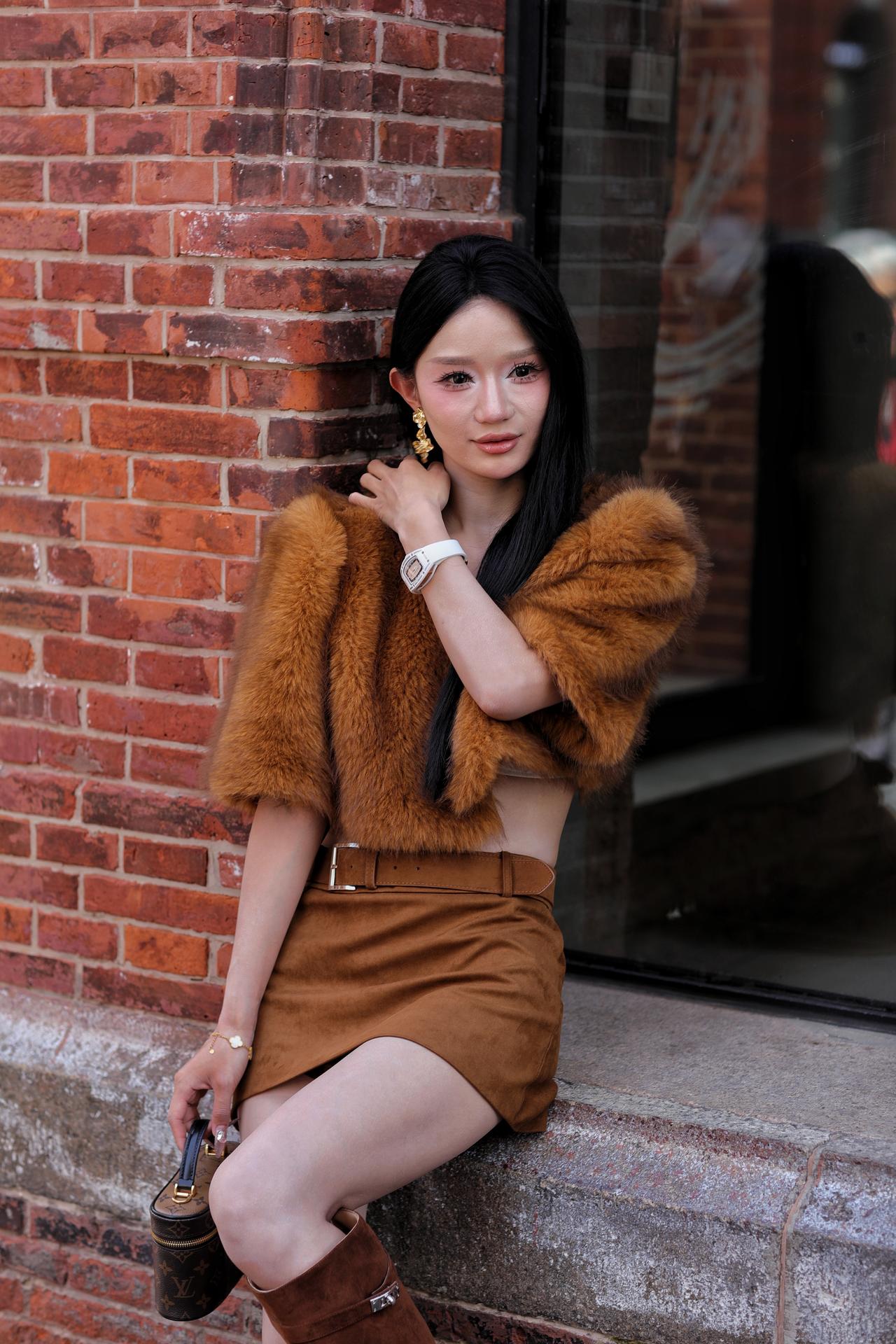 暖棕皮草裹挟着秋日的慵懒贵气,短款设计利落露腰,勾勒出玲珑腰线,同色系麂皮短裙与高筒靴形成完美呼应,整套造型在复古红砖墙前,晕染出浓郁的美式复古氛围。黑长直发丝柔顺垂落,金饰耳坠与白镯点缀细节,慵懒倚靠的姿态、松弛的神情,将都市女郎的精致与随性完美融合。