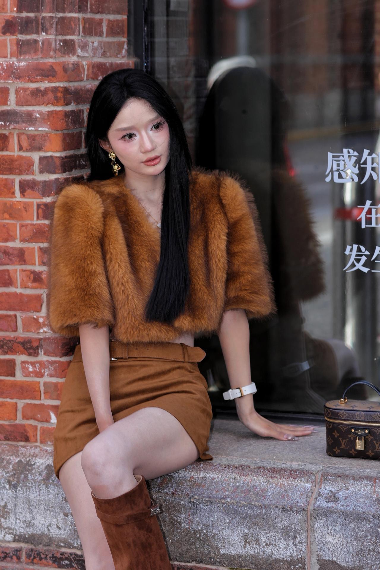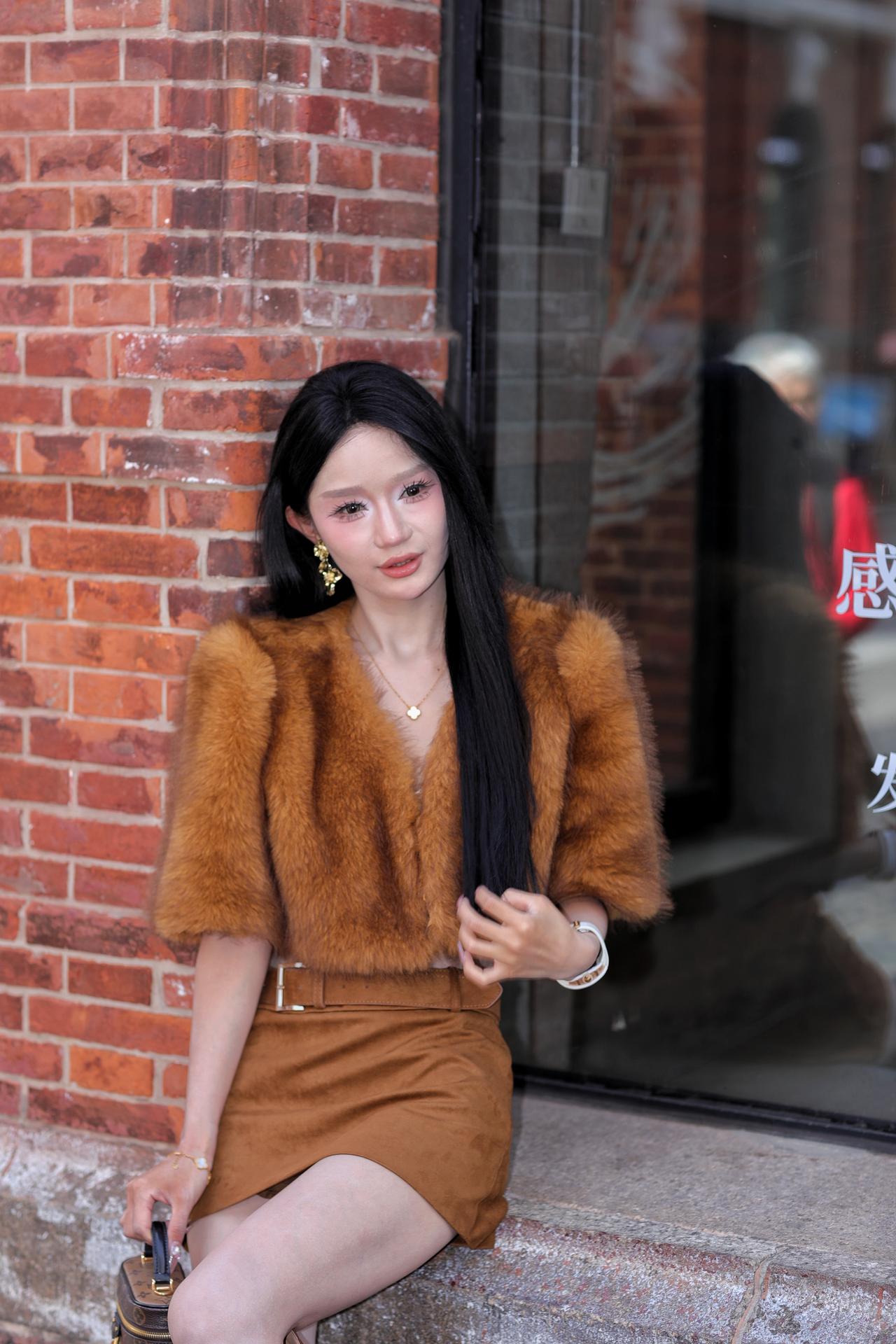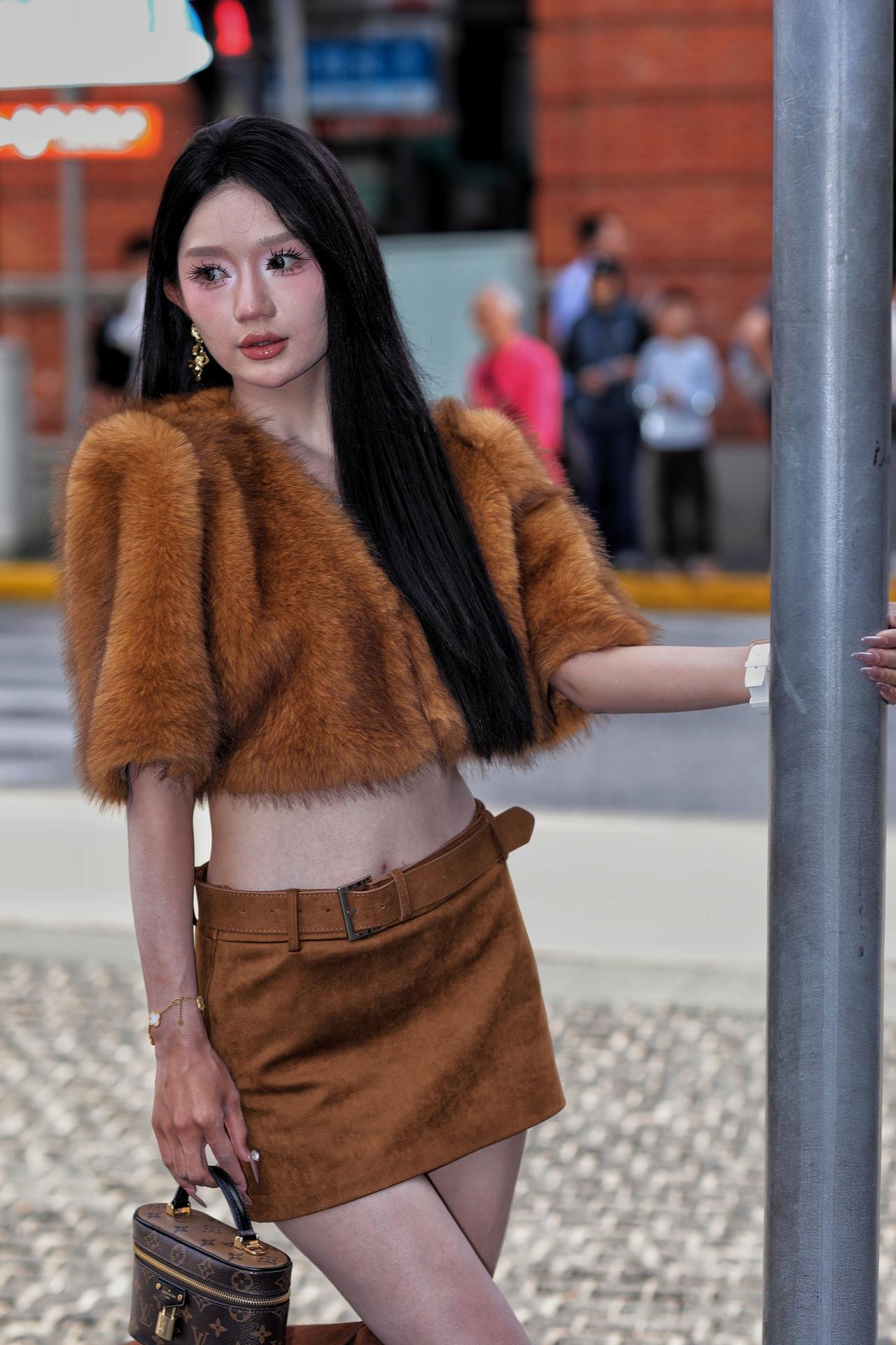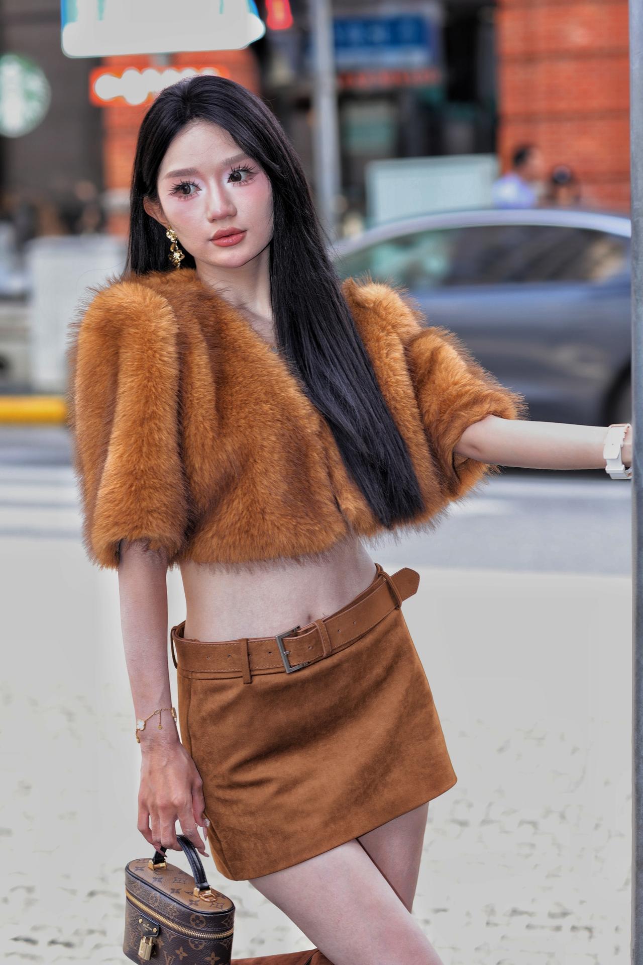 暖棕皮草裹挟着秋日的慵懒贵气,短款设计利落露腰,勾勒出玲珑腰线,同色系麂皮短裙与高筒靴形成完美呼应,整套造型在复古红砖墙前,晕染出浓郁的美式复古氛围。黑长直发丝柔顺垂落,金饰耳坠与白镯点缀细节,慵懒倚靠的姿态、松弛的神情,将都市女郎的精致与随性完美融合。