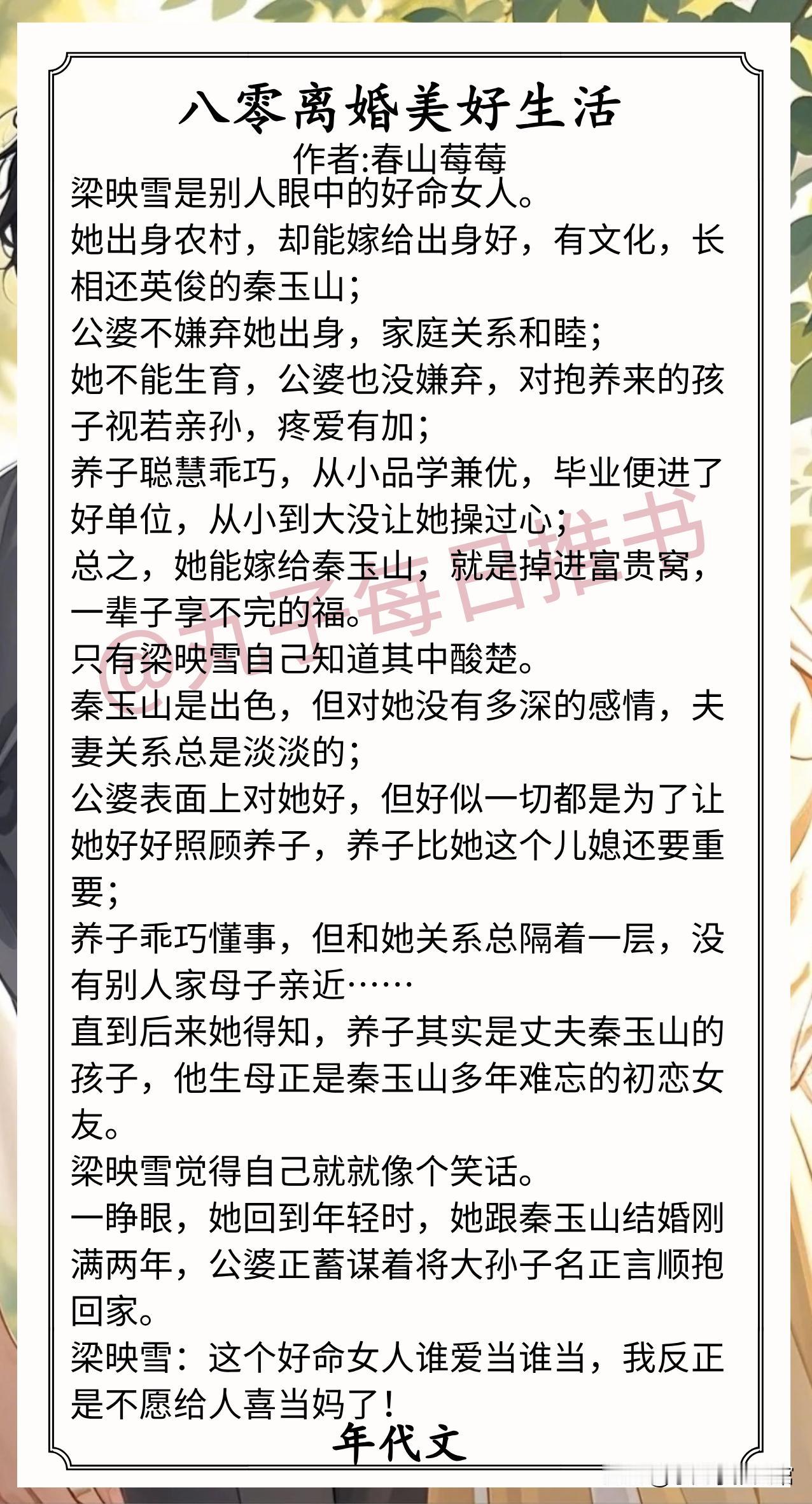 3.《八零离婚美好生活》作者:春山莓莓(美艳泼辣vs假斯文真绿茶,重生,家长里短,前任扬灰,姐弟恋)