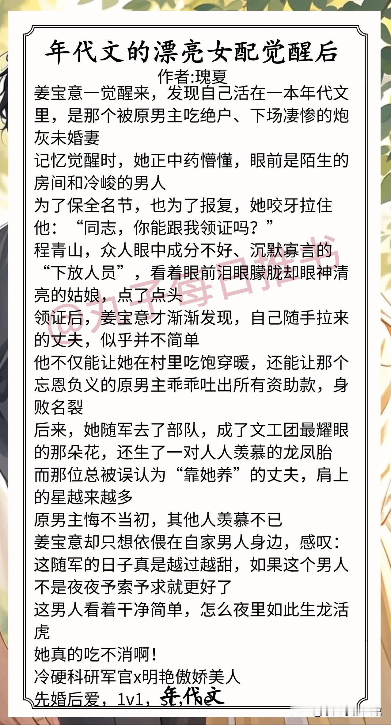 5.《年代文的漂亮女配觉醒后》作者:瑰夏(明艳傲娇美人vs冷硬科研军官,穿书,先婚后爱,年代甜宠文)