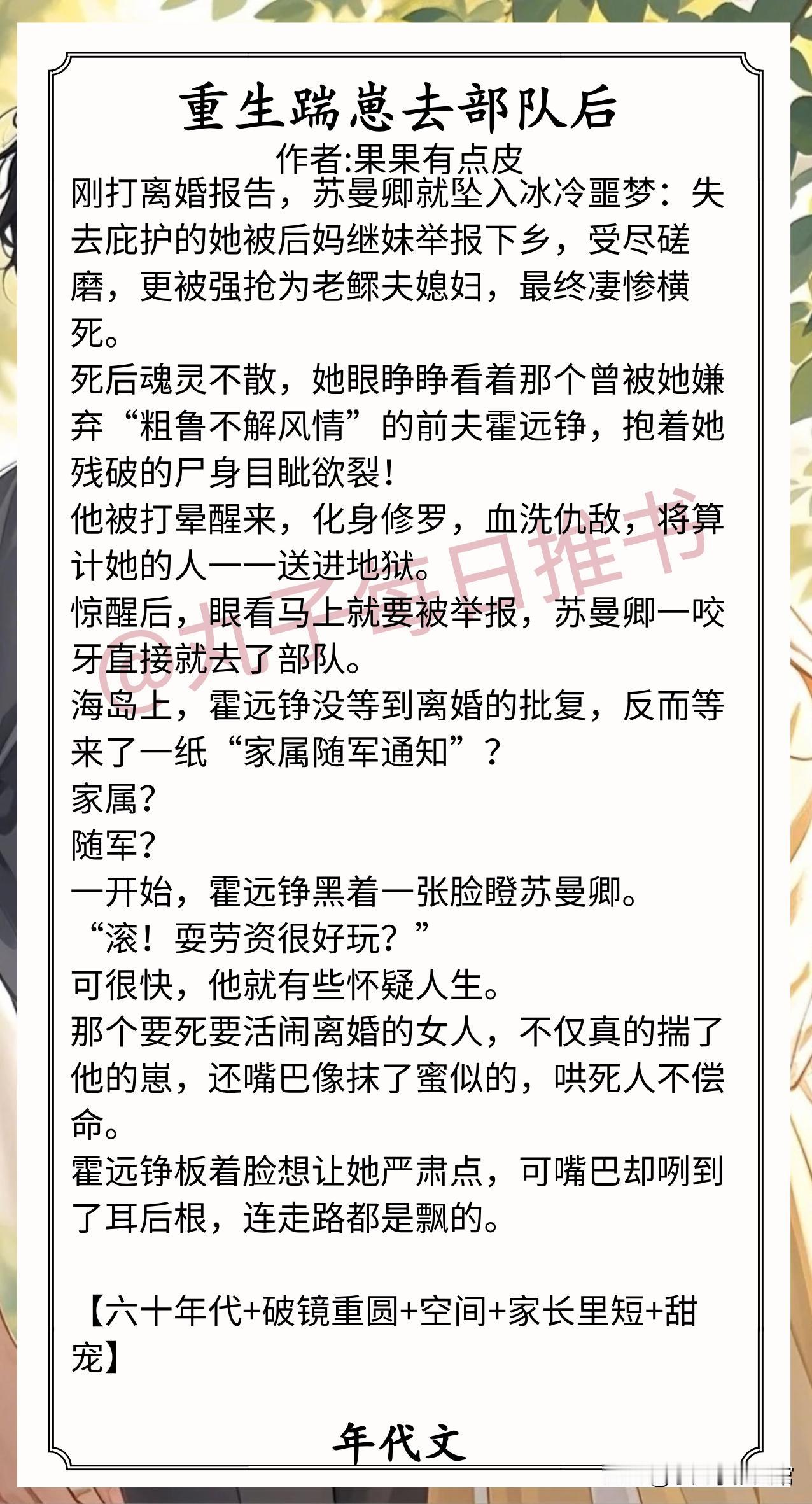 4.《重生踹崽去部队后》作者:果果有点皮(娇气美人vs宠妻糙汉,预知梦,婚恋,家长里短,60年代甜宠文)