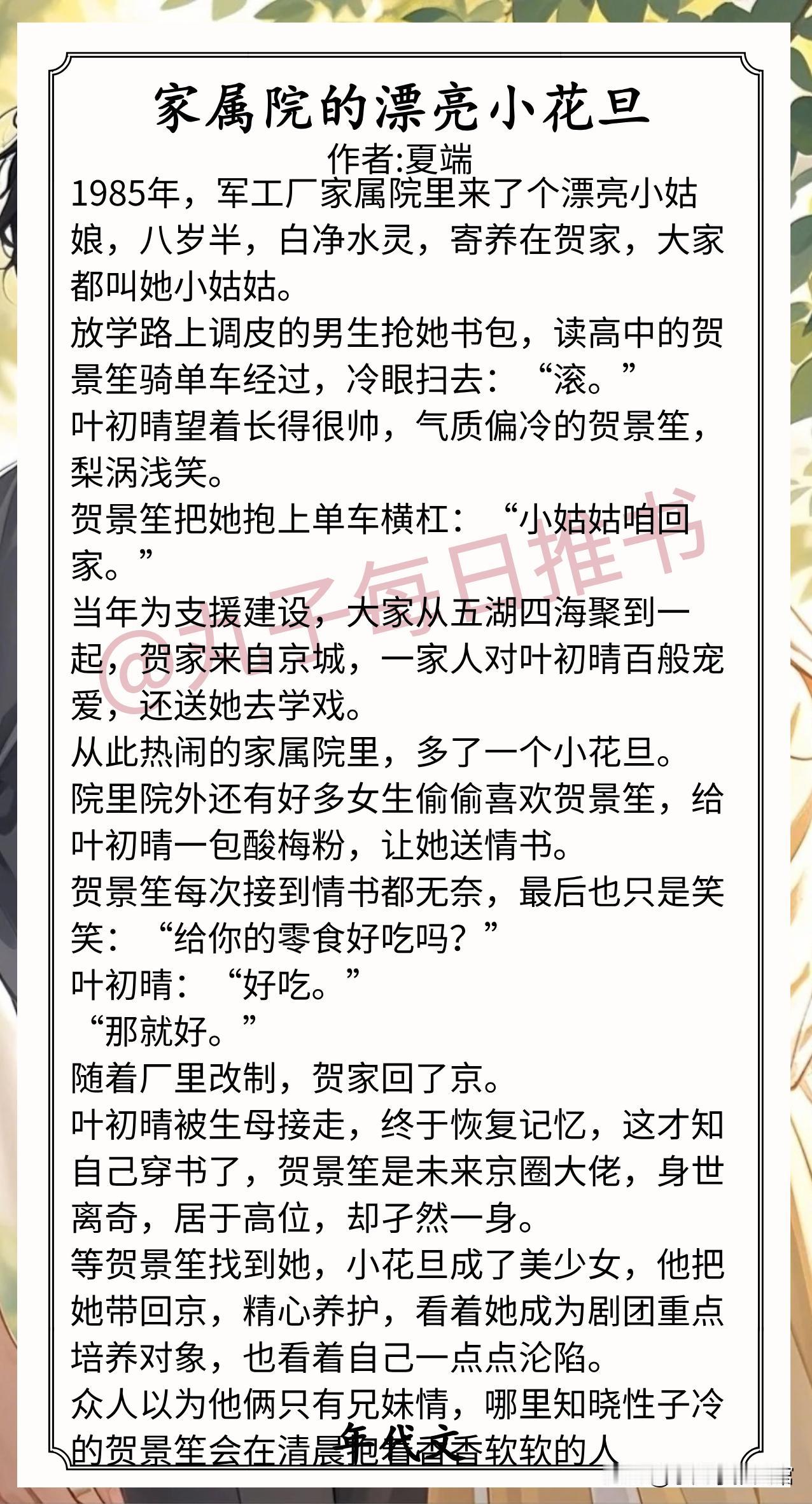 8.《家属院的漂亮小花旦》作者:夏端(乖萌小花旦vs清冷温柔哥,寄住梗,青梅竹马,家长里短,80年代甜宠文)