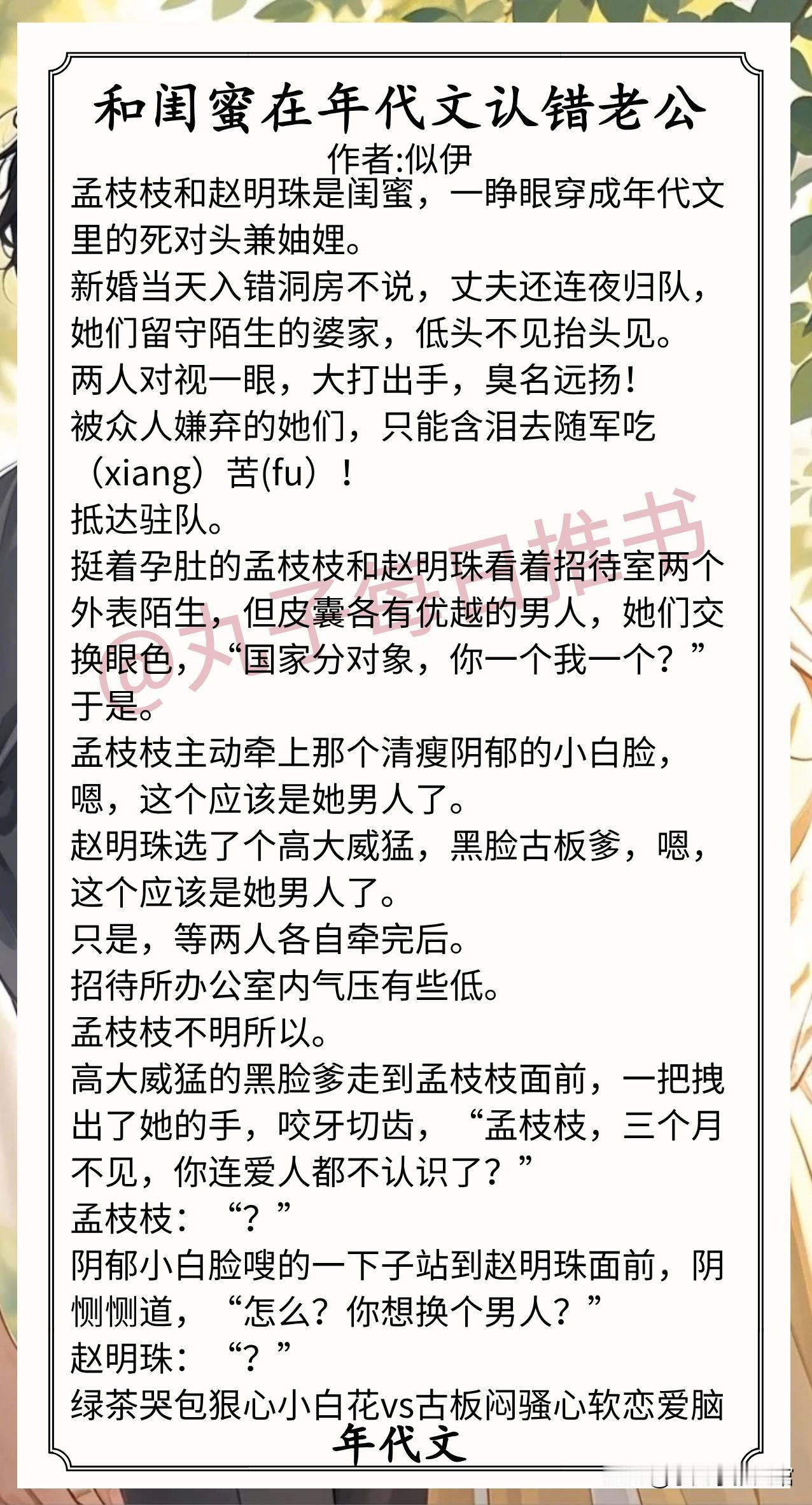 9.《和闺蜜在年代文认错老公》作者:似伊(双cp。绿茶哭包狠心小白花vs古板闷骚心软恋爱脑;美艳武力值满分迟钝飒姐姐vs年下占有欲超强直球小狼狗)小说 推文