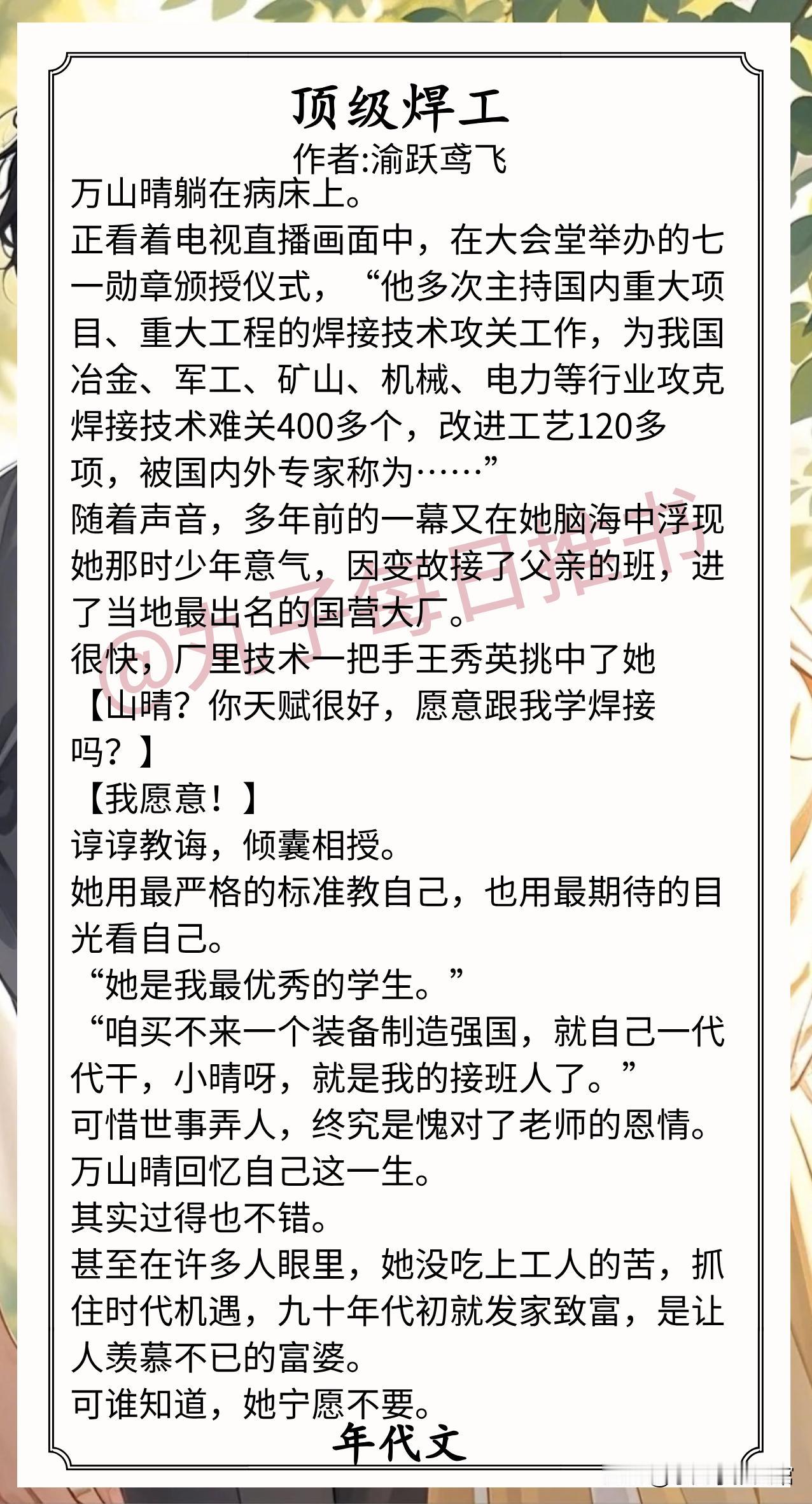 6.《顶级焊工》作者:渝跃鸢飞(事业批女vs背景板男,重生,升级流,八零年代职业向技术爽文)
