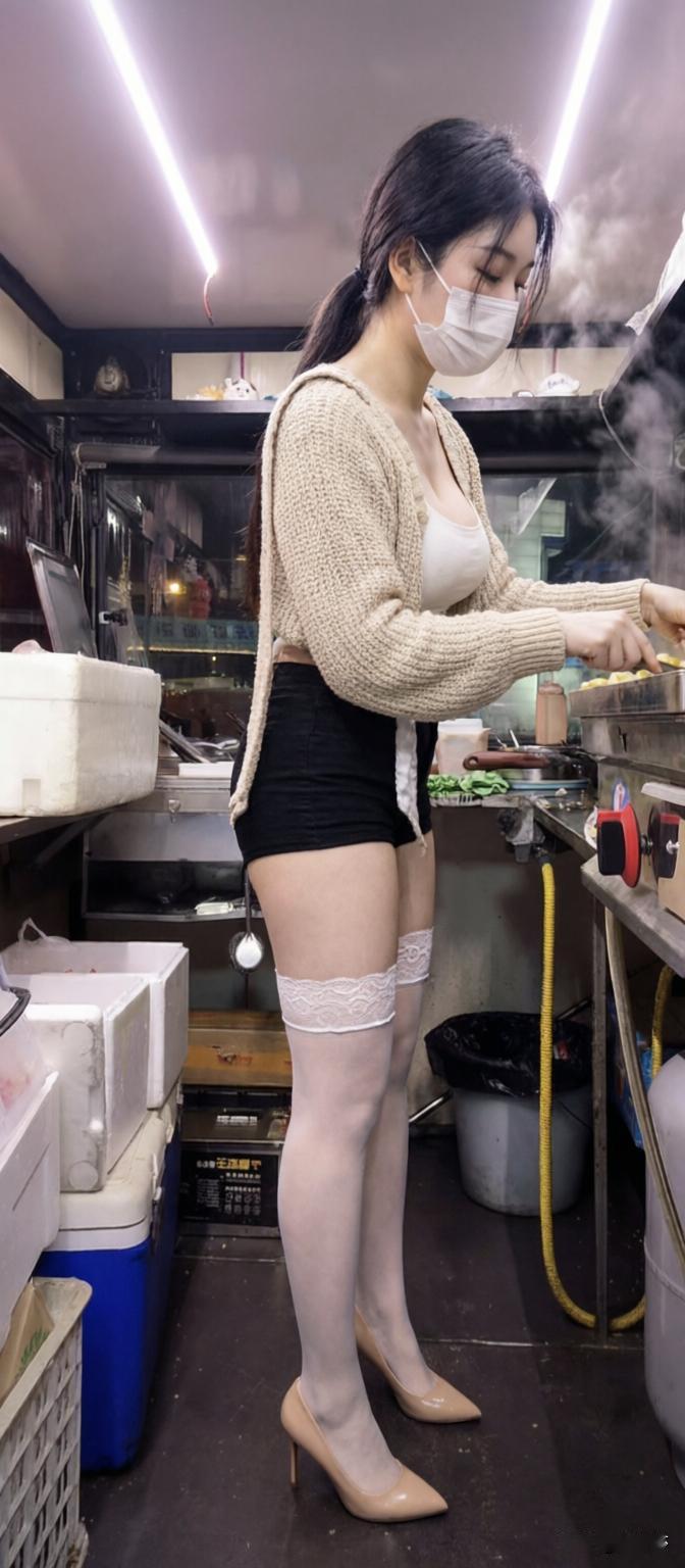 纯天然的烧烤,今晚出摊啦!刚把炉子点起来,炭火正旺,烟雾缭绕的特别有烟火气。穿成这样干活确实不太方便,但为了拍点素材也是拼了,米色开衫配黑短裤,再踩个高跟鞋,我自己都觉得有点混搭。白色丝袜是怕油溅到腿上,蕾丝边还挺好看的。这会儿正翻着烤串,香味已经开始飘出来了。旁边保温箱里冰着啤酒,等下客人来了就能喝上冰的。虽然站一晚上挺累的,但看着大家吃得开心就值了。你们爱吃烤啥?我手艺还是不错的,有空来尝尝啊!烧烤摊自拍 烧烤店自拍