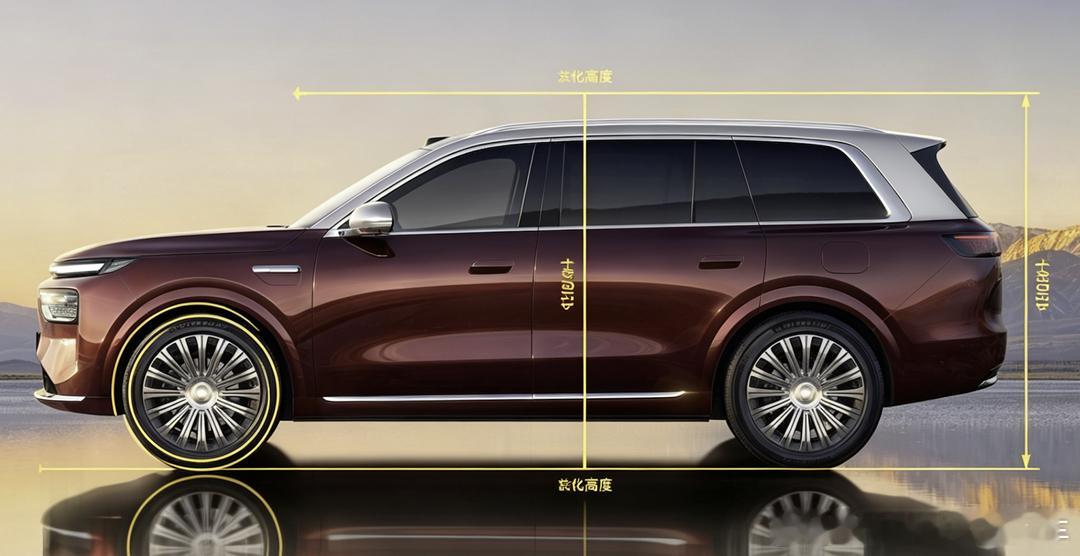 通过官图粗略测量,轮高比大致在0.44-0.45,在大型9系 SUV中属于第一梯队水平,与奔驰 GLS、揽胜、蔚来ES9、问界M9等比例表现相当。所以奕境X9的侧面具有高端9系SUV所强调要具备的“领导力”气场。