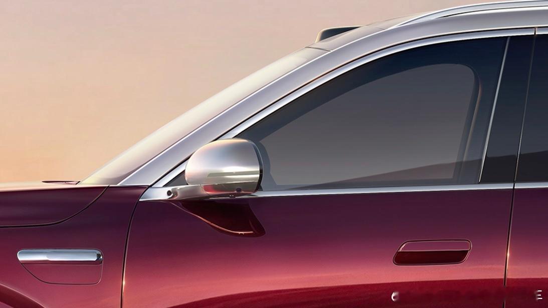 官图车型采用了双色车身,其中车顶采用银色/白色的悬浮式设计,和酒红色车身形成上下分割,好处是把车身视觉重心“压低”;同时车顶线条从A柱到D柱的过渡平缓,既保证了第三排头部空间,又营造出修长的侧影。