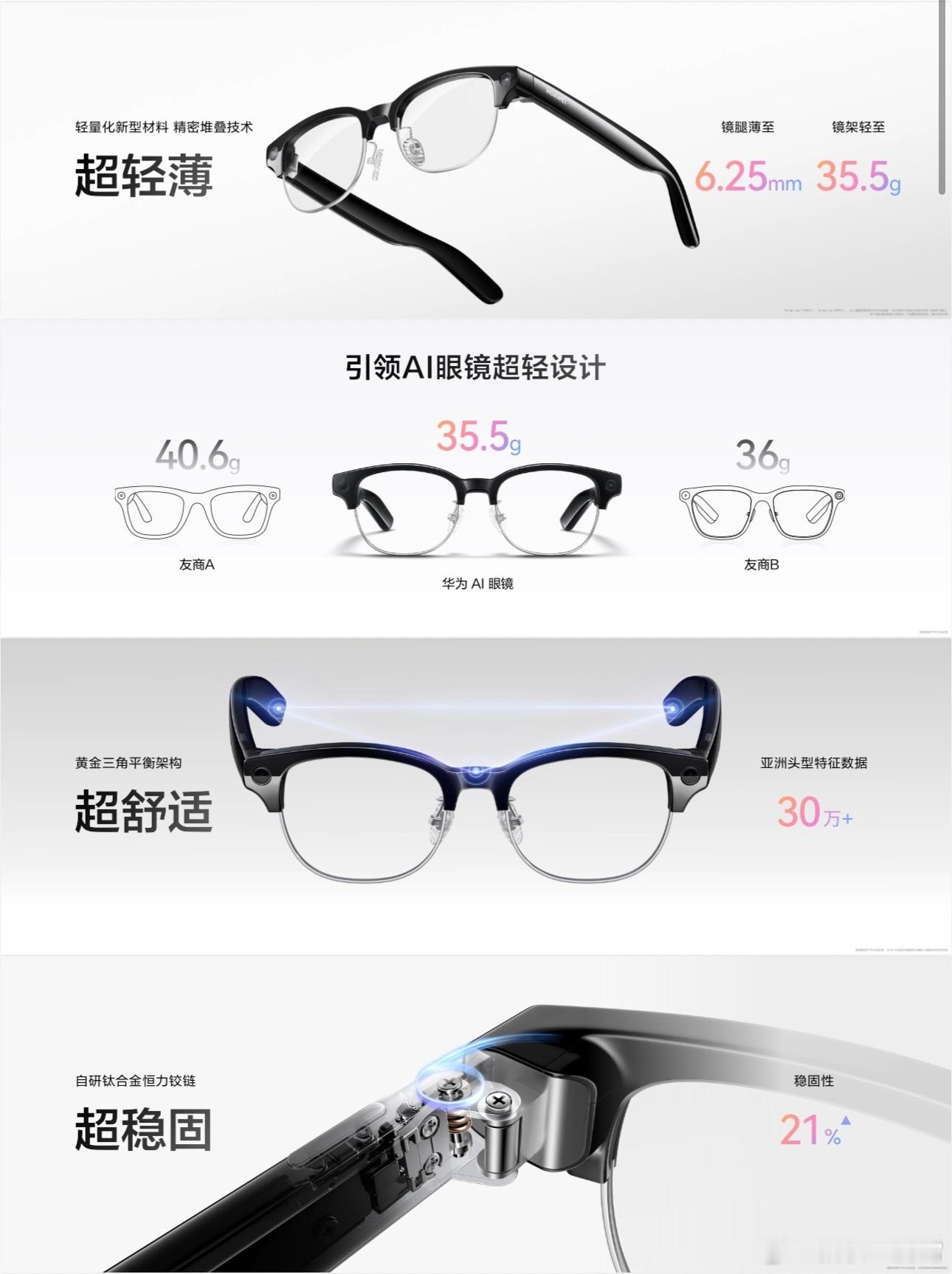 之前也试过几款能拍照的眼镜,要么画质太糊要么快门太慢。华为这次算是把痛点都解决了,1200万超大底,0.7秒闪拍基本无延迟,AI构图矫正对新手很友好,样片视频中能看出来录像防抖做的也很棒。而且它不像别的眼镜那样傻大黑粗,35.5克比我的板材眼镜轻多了,准备冲了。华为发布业界最轻AI眼镜