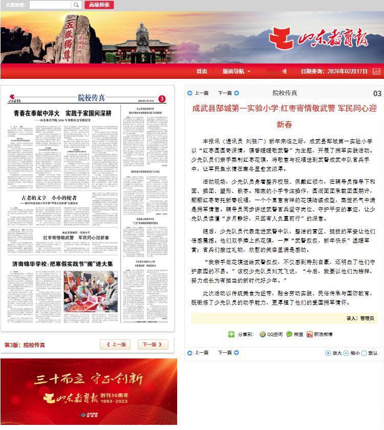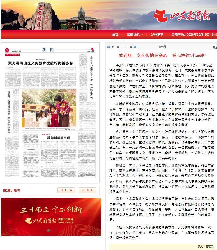 今年以来,在《山东教育报》发表了 6 篇关于成武教育的新闻通讯,从校园活动到特色课程,从乡村寄宿制建设到传统文化进校园,每一篇稿件的背后,都是成武教育人用心用情的真实写照。