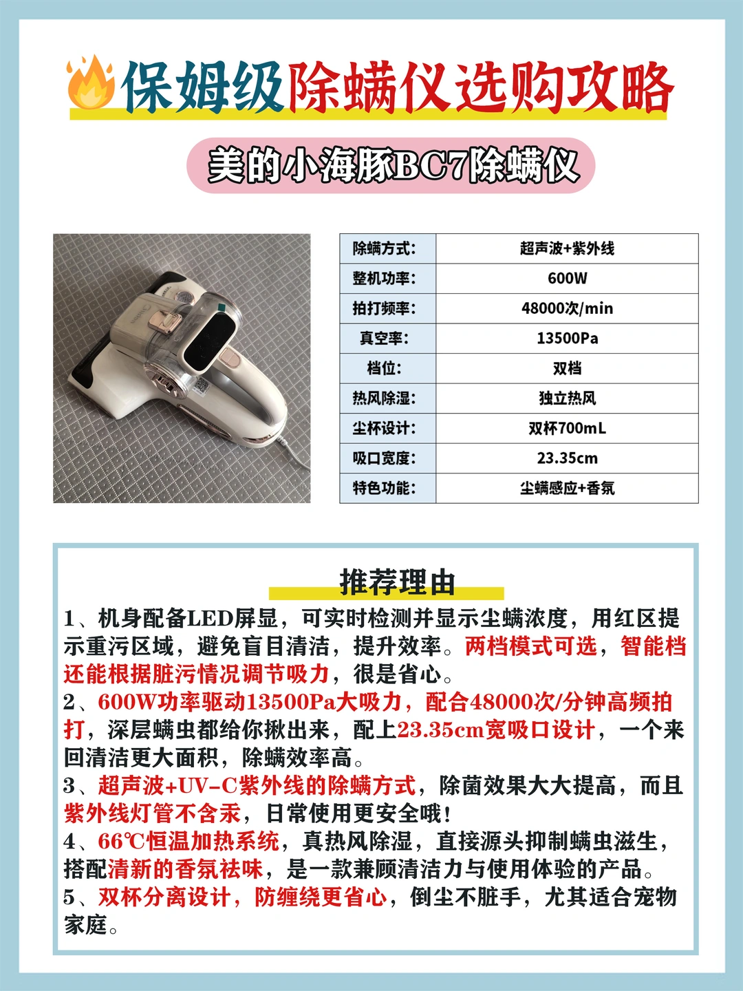 👀经过几天的研究做攻略,我觉得美的小海豚BC7除螨仪就很不错,机身配备LED屏显,两档模式可选,智能档还能根据脏污情况调节吸力。