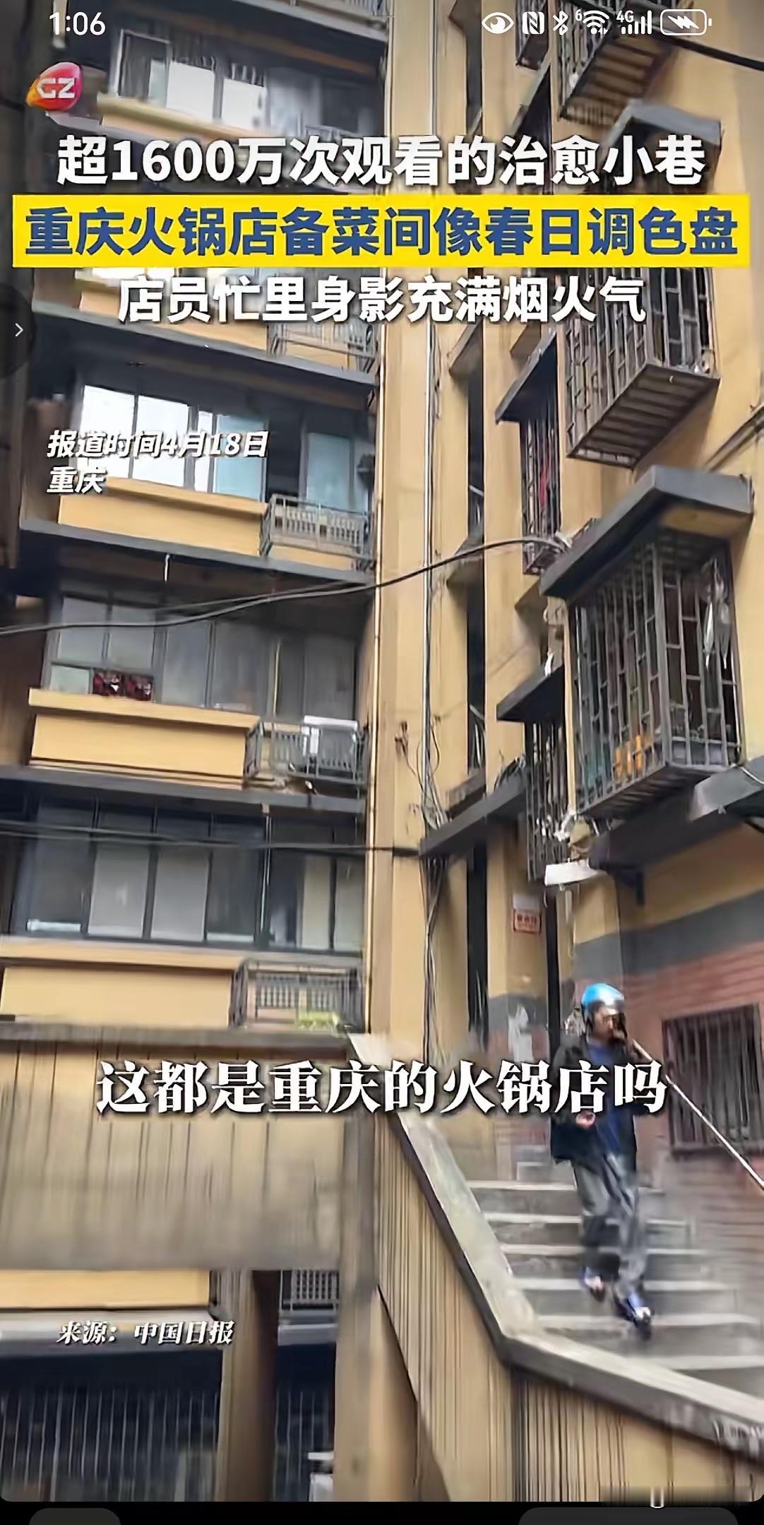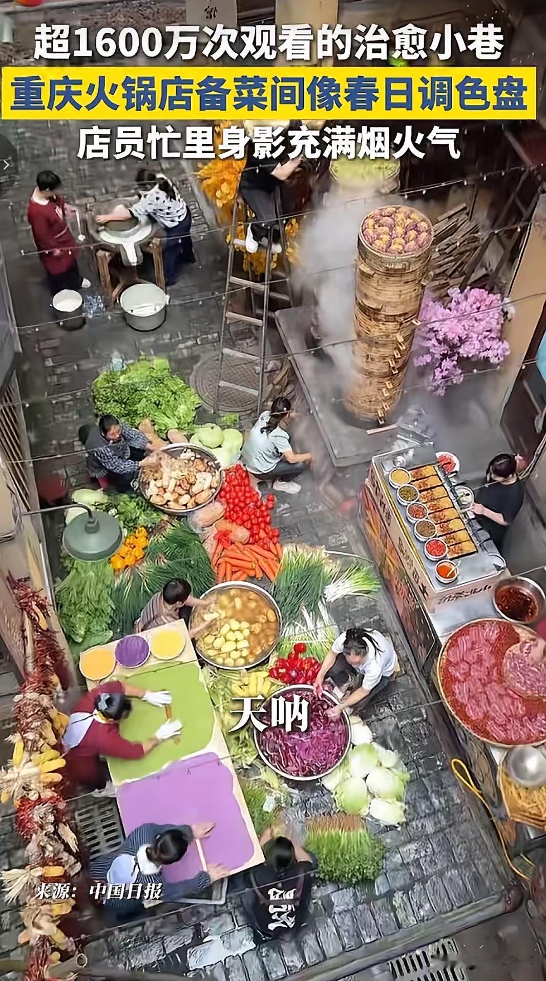 一位游客在一栋居民楼里,拍下了天井里重庆一家火锅馆后厨备菜的一幕,吸引了众多网友观看并被央媒转发点赞。