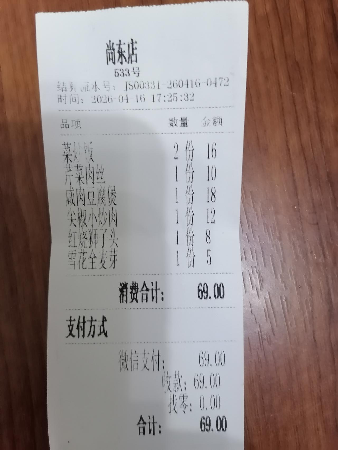 又喝了一瓶雪花全麦芽,总共花费69块钱。