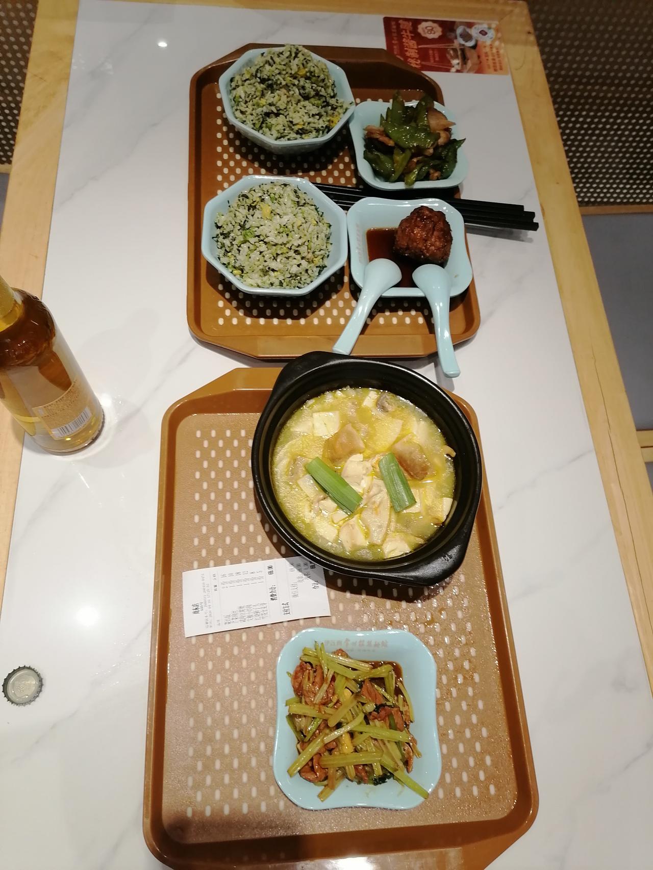 我们三个人,点了两碗菜炒饭,还各要了一份芹菜肉丝、咸肉豆腐煲、尖椒小炒肉和红烧狮子头。