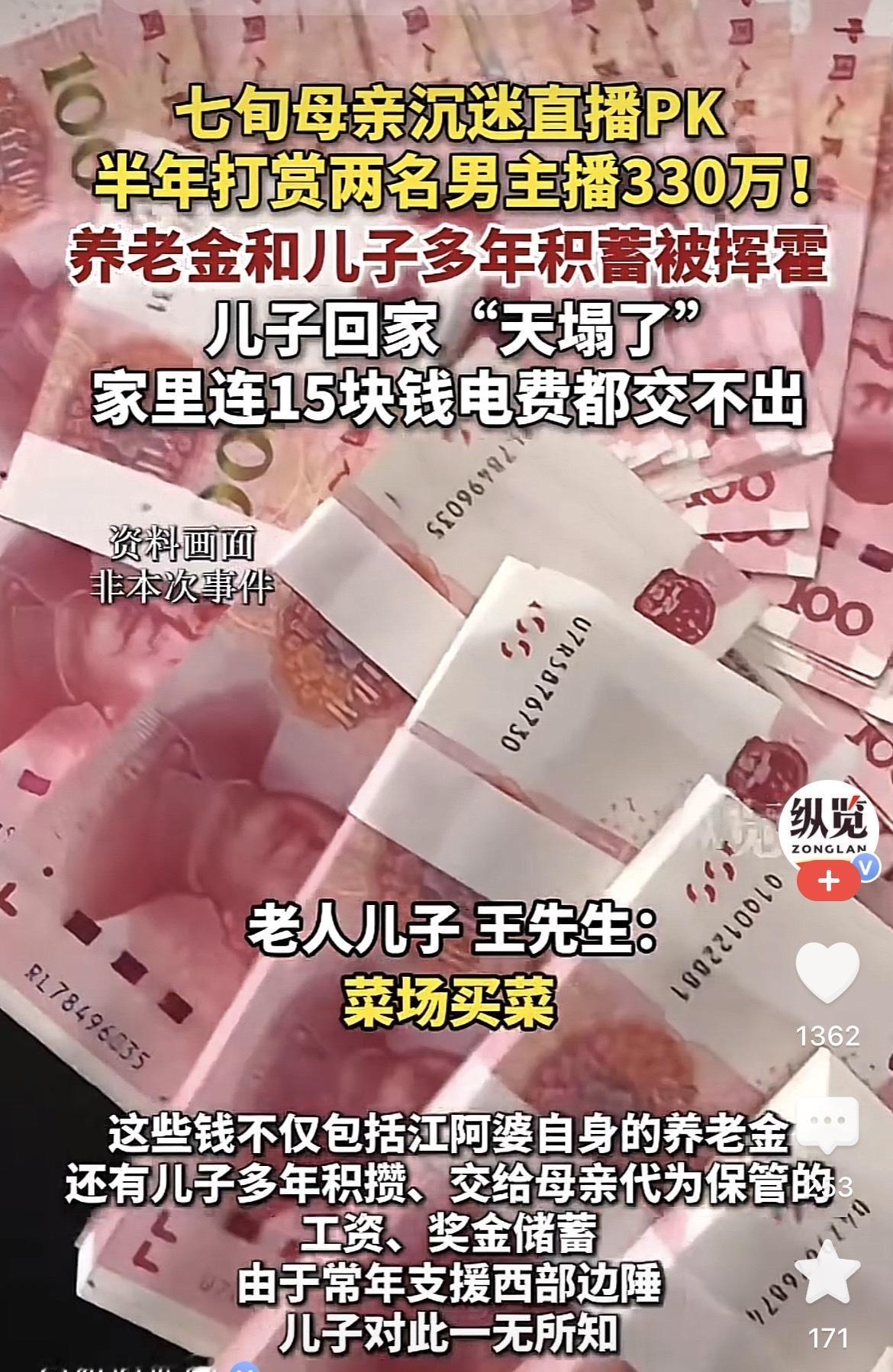 昨天才看到新闻一个七旬老太太半年天天看直播,打赏了两个男主播330万,而且这钱还是儿子的全部积蓄和自己的养老金。