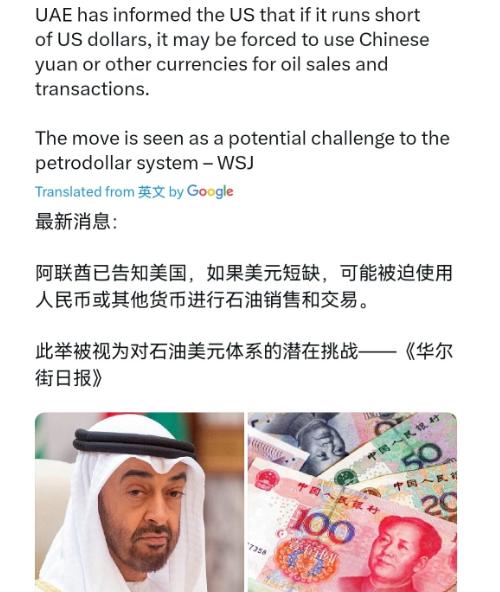 阿联酋王储访华刚结束,就给美国出了一个难题!4 月 20 日,据美国《华尔街日报》报道,美媒称,阿联酋已向美国告知,倘若出现美元短缺的情况,该国或许会被迫使用人民币或是其他货币开展石油销售与相关交易。美媒表示,这一举动无疑对石油美元体系形成了潜在挑战。很明显,阿联酋的此番表态,时间点显得十分特殊。
