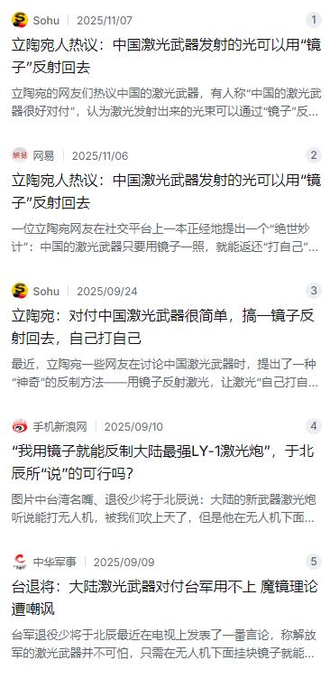 立陶宛人热议中国激光武器称:中国激光武器很好对付,激光武器发射的光可以用“镜子”反射回去,让他自己打自己。无独有偶,台湾省退役少将于北辰在多个场合放言:要是激光武器打无人机,就在无人机下面挂一面“镜子”把激光反射回去!