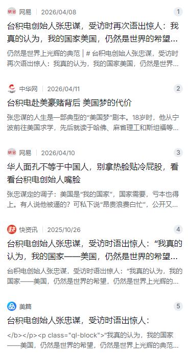 台积电创始人张忠谋,受访时再次语出惊人:“我真的认为,我的国家——美国,仍然是世界的希望,仍然是世界上光辉的典范!”他还强调:“自从我来到美国并于1962年入籍以来,我的身份一直是美国人,除此之外别无其他!”张忠谋的人生真正成型、定型的阶段全都在美国,十九岁还是个懵懂青年就踏上了美国的土地。