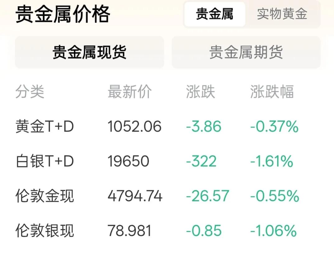 今天是2026年4月21日,星期二,现在是中午12点钟。今天黄金开盘数据显示一片绿。黄金价格下跌了!当前的国际金价是1052元每克,最高开是1057元每克。最低开1051元每克。开盘是1054元每克。昨结是1055元每克。目前的黄金价格处于轻微的下跌趋势。今天黄金的开盘数据是高开低走。