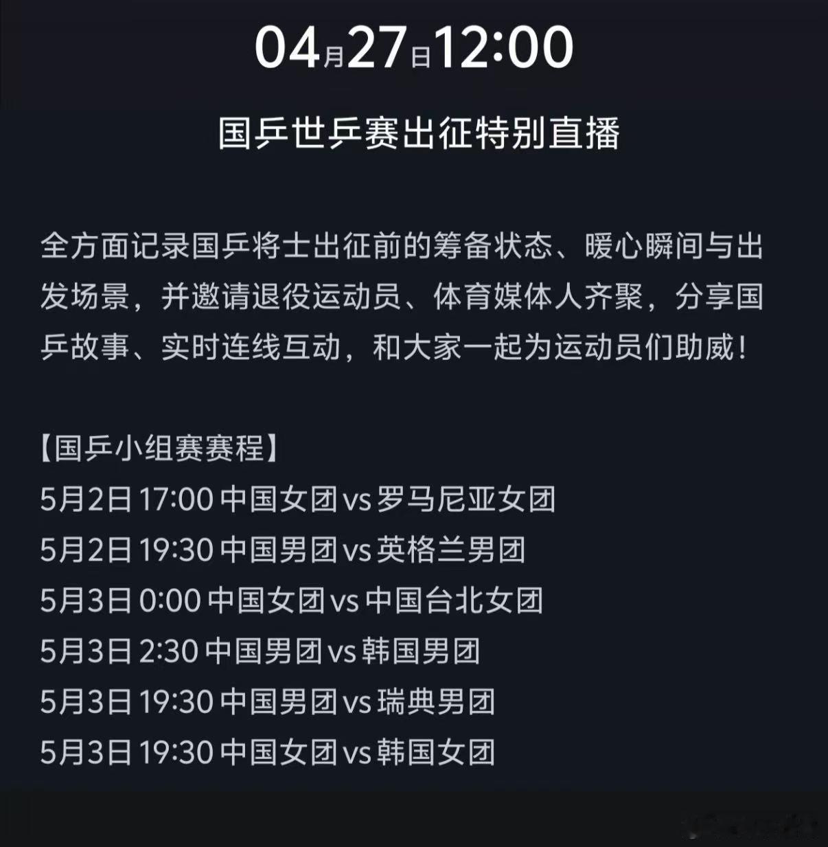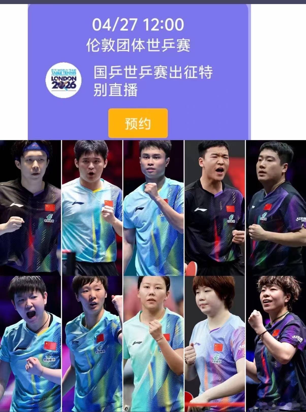 国乒世乒赛出征特别节目央视官宣4月27日12点上线伦敦世乒赛出征特别直播。恰逢百