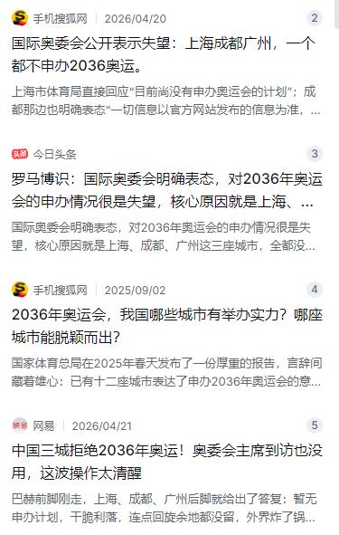 可巴赫刚走,三座城市就给出了答复。上海市体育局直接回应“目前尚没有申办奥运会的计划”;成都那边的表态更干脆——“一切信息以官方网站发布为准,官方网站没有发布就是没有”;广州正忙着筹备十五运会,压根不接这个茬。连“我们正在研究”的场面话都省了。