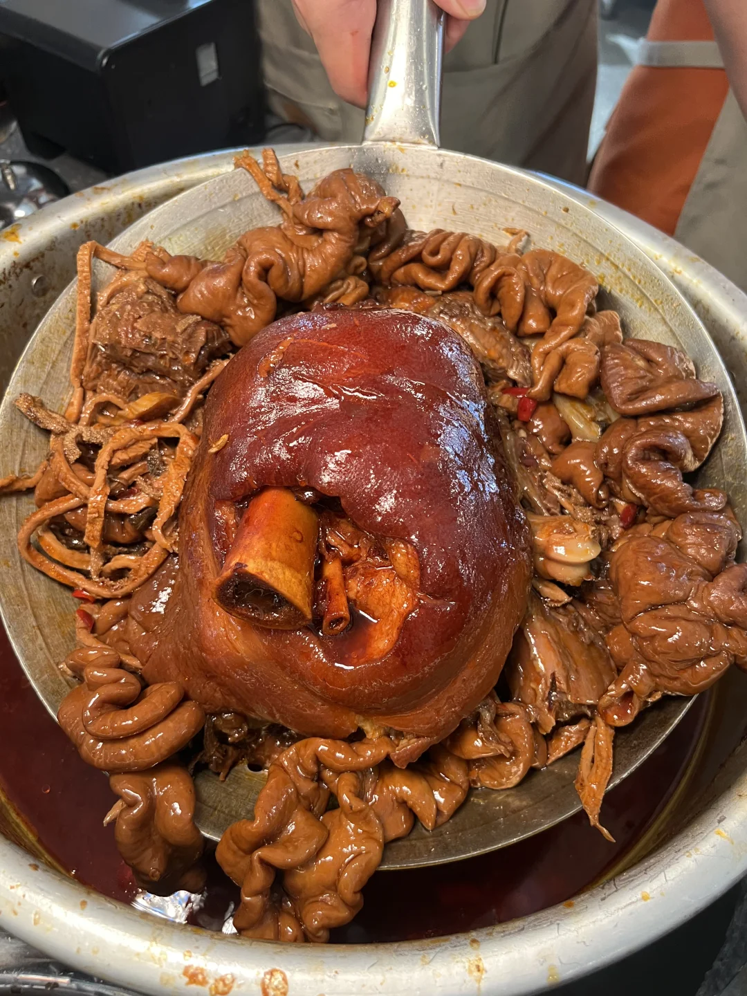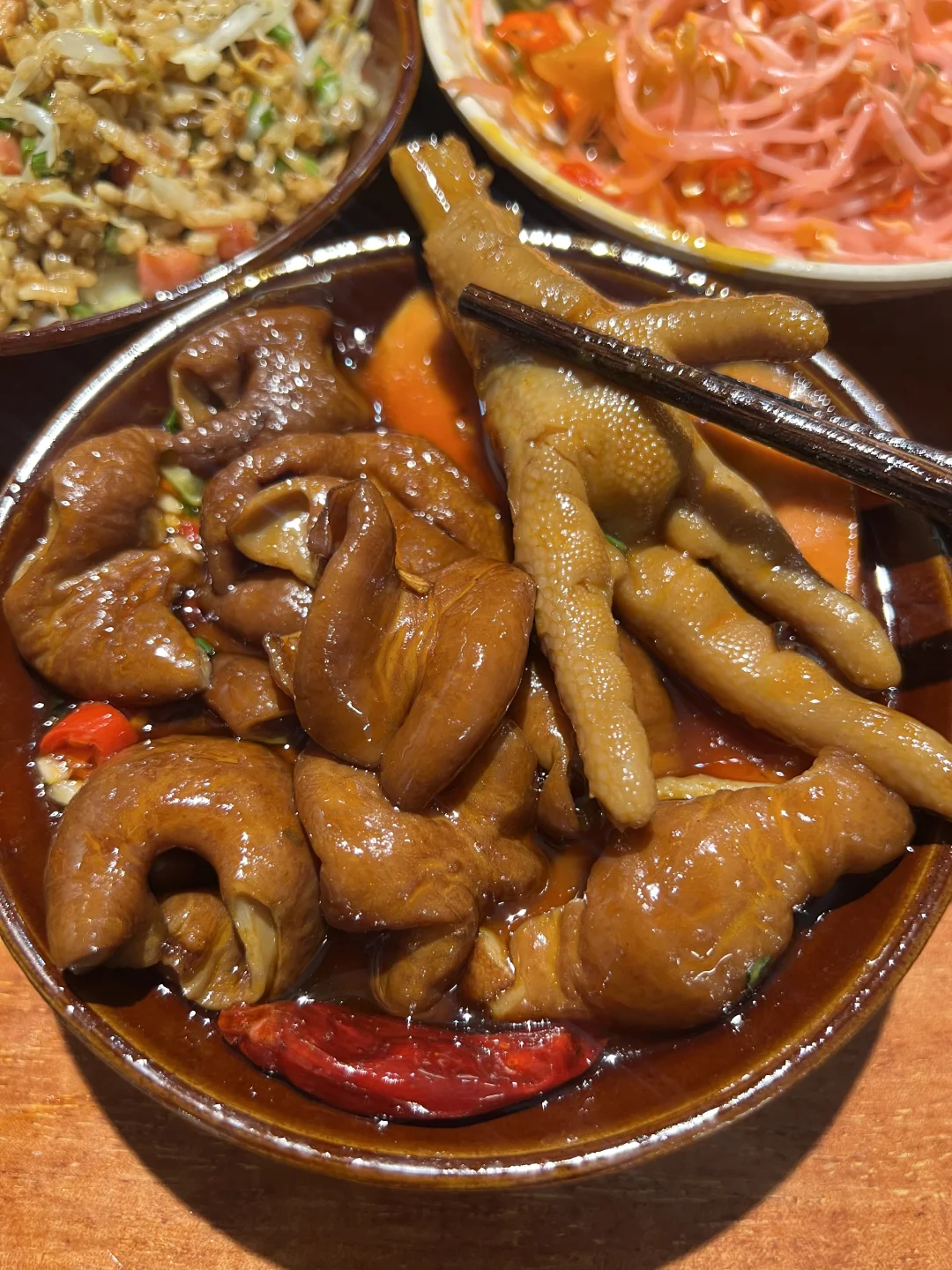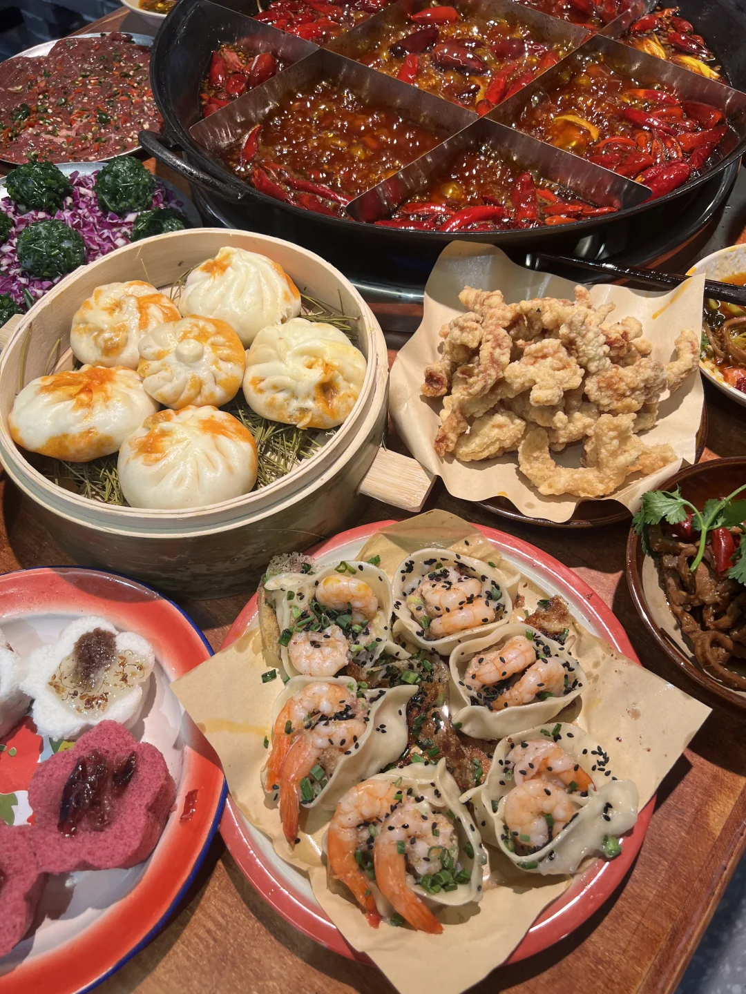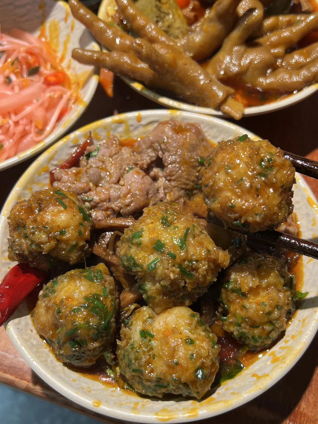 火锅菜的话耙鸡爪、耙糯肥肠……都很好吃,卤的很香!!沙葱黑虎虾滑真的很鲜,真的有虾,沙葱太提香了!