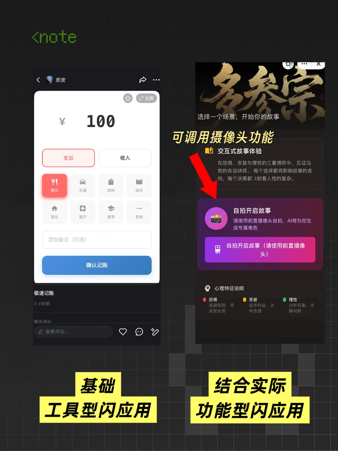 这就意味着生成的不是简单内容交互闪应用了,而是就能结合实际生活使用的功能型工具。比如学长就看到有人搓了个“心迹故事”闪应用,拍摄自己的照片,能生成属于自己的剧本故事。