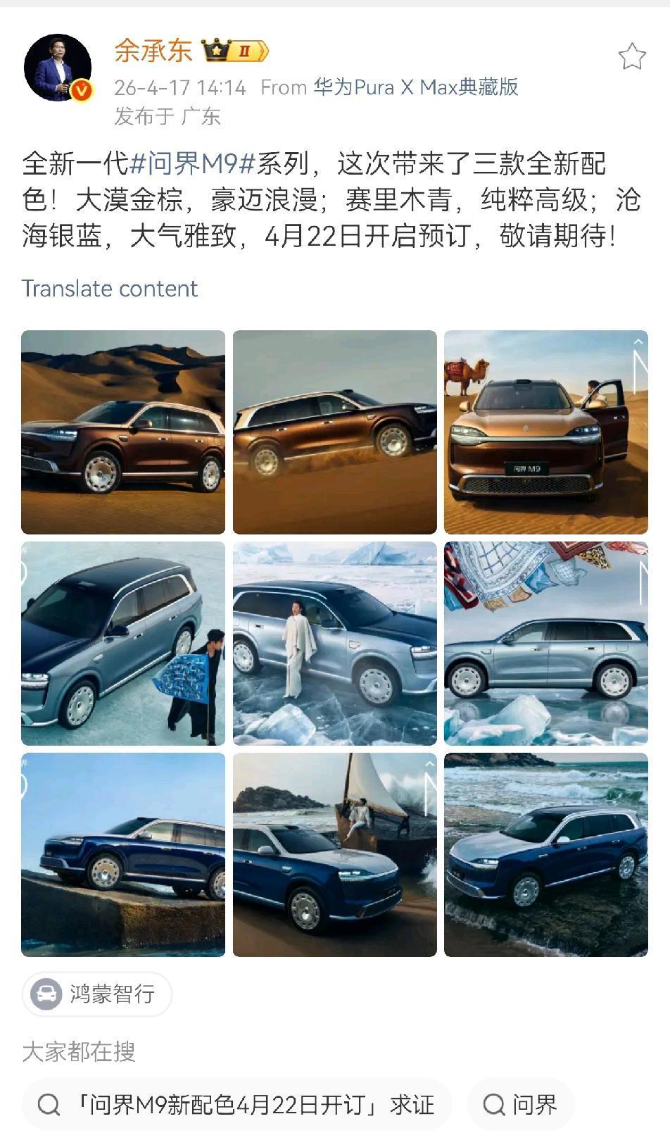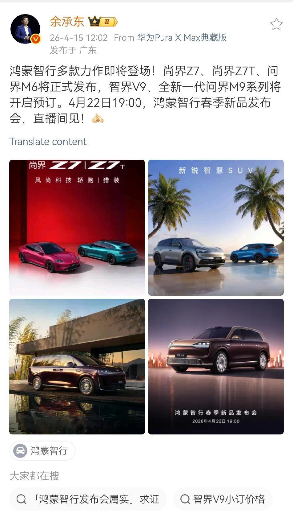 余承东鸿蒙智行,五车齐发,饱和攻击。老余这次堪称史上最强阵容,全新问界M9、首发问界M6、尚界Z7/Z7T、智界V9。车型、价格带全覆盖。预计全系乾崑智驾ADS 5、鸿蒙座舱6,896线激光雷达,更有问界M9的6激光雷达方案首发亮相。剧透还有肖战官宣尚界代言人。