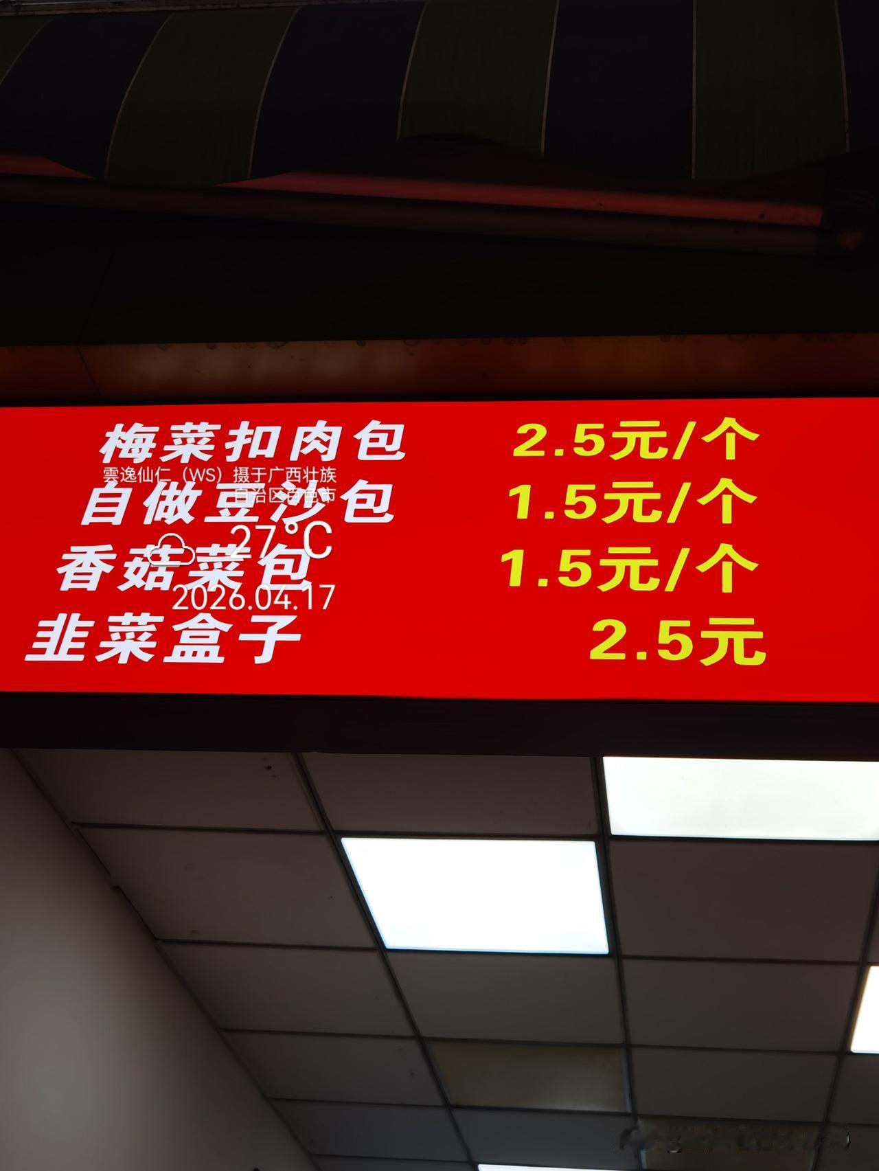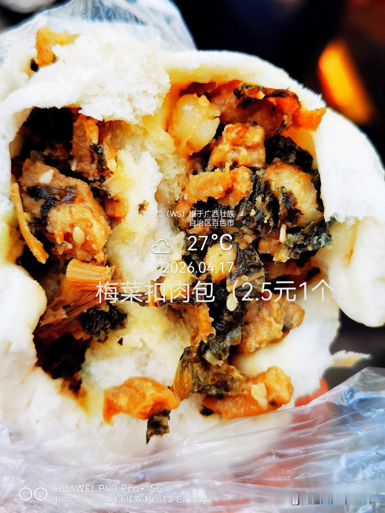 旅居生活记录(9525)广西壮族自治区百色市(210)品尝小吃55:筒骨淮山肉粥(6元1大碗)、三角饼(9元1袋10个/400克)、梅菜扣肉包(2.5元1个)、大麦青汁(6.5元1瓶/650ml。