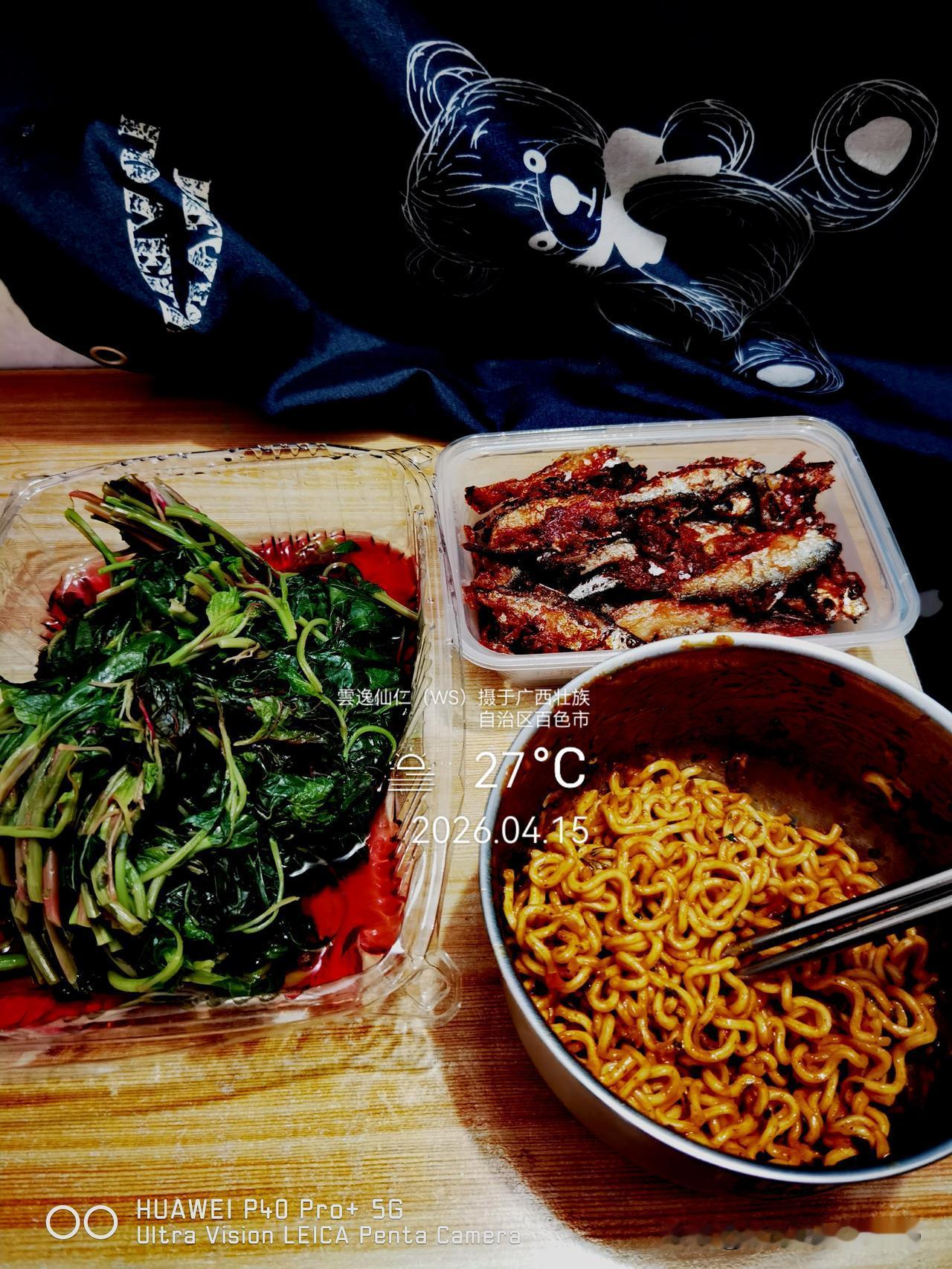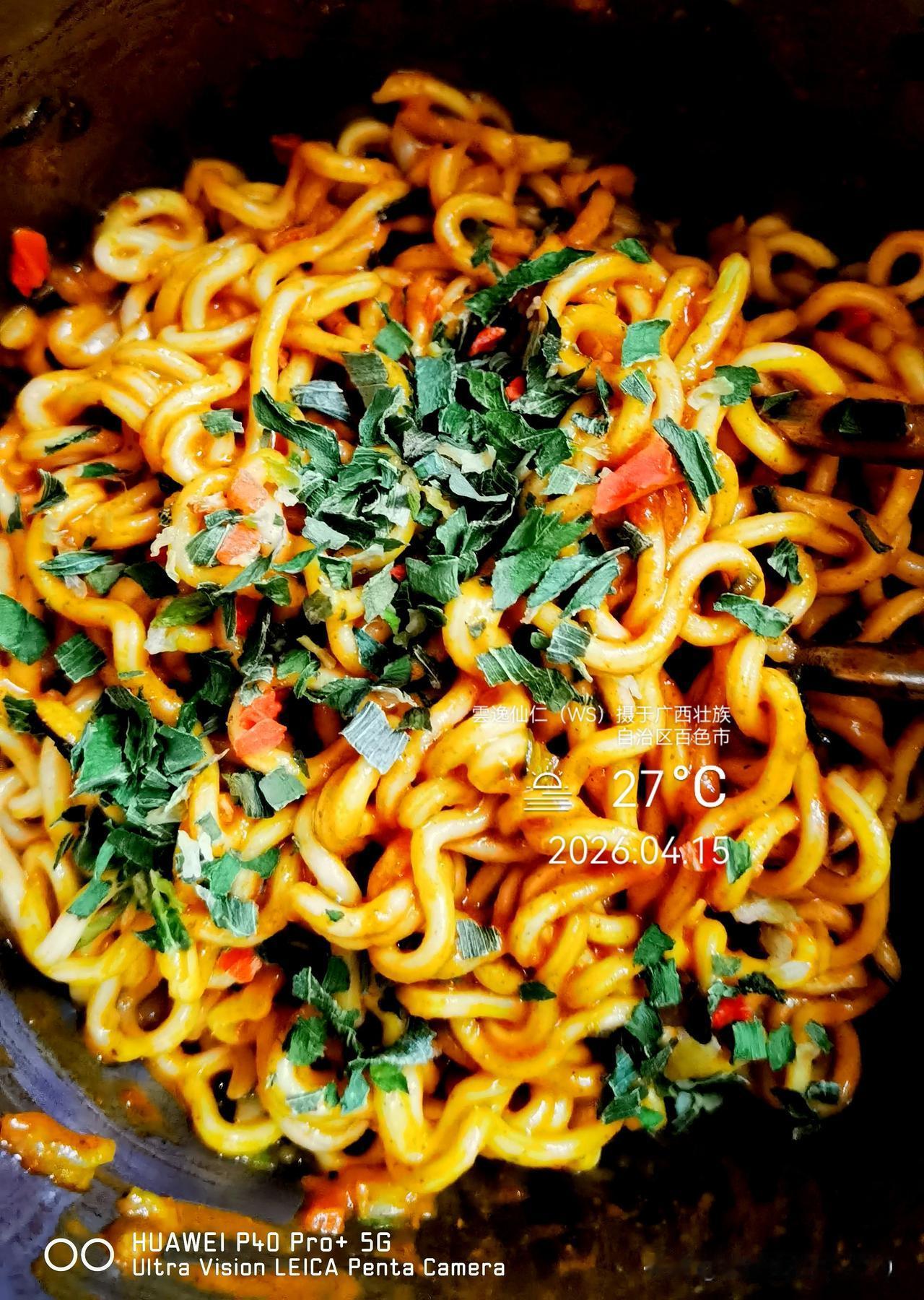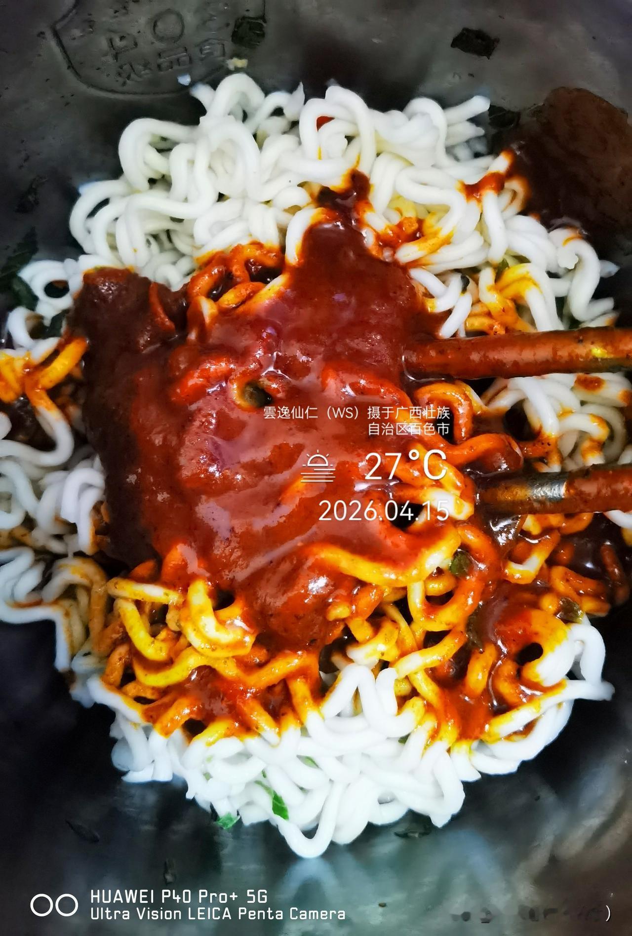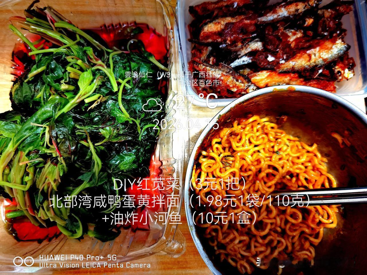 旅居生活记录(9530)广西壮族自治区百色市(216)品尝小吃54:斑斓粉(3元1杯)、DIY红苋菜(3元1把)北部湾咸鸭蛋黄拌面(1.98元1袋/110克)+油炸小河鱼(10元1盒)、辣条(1.9元1袋/120克)。