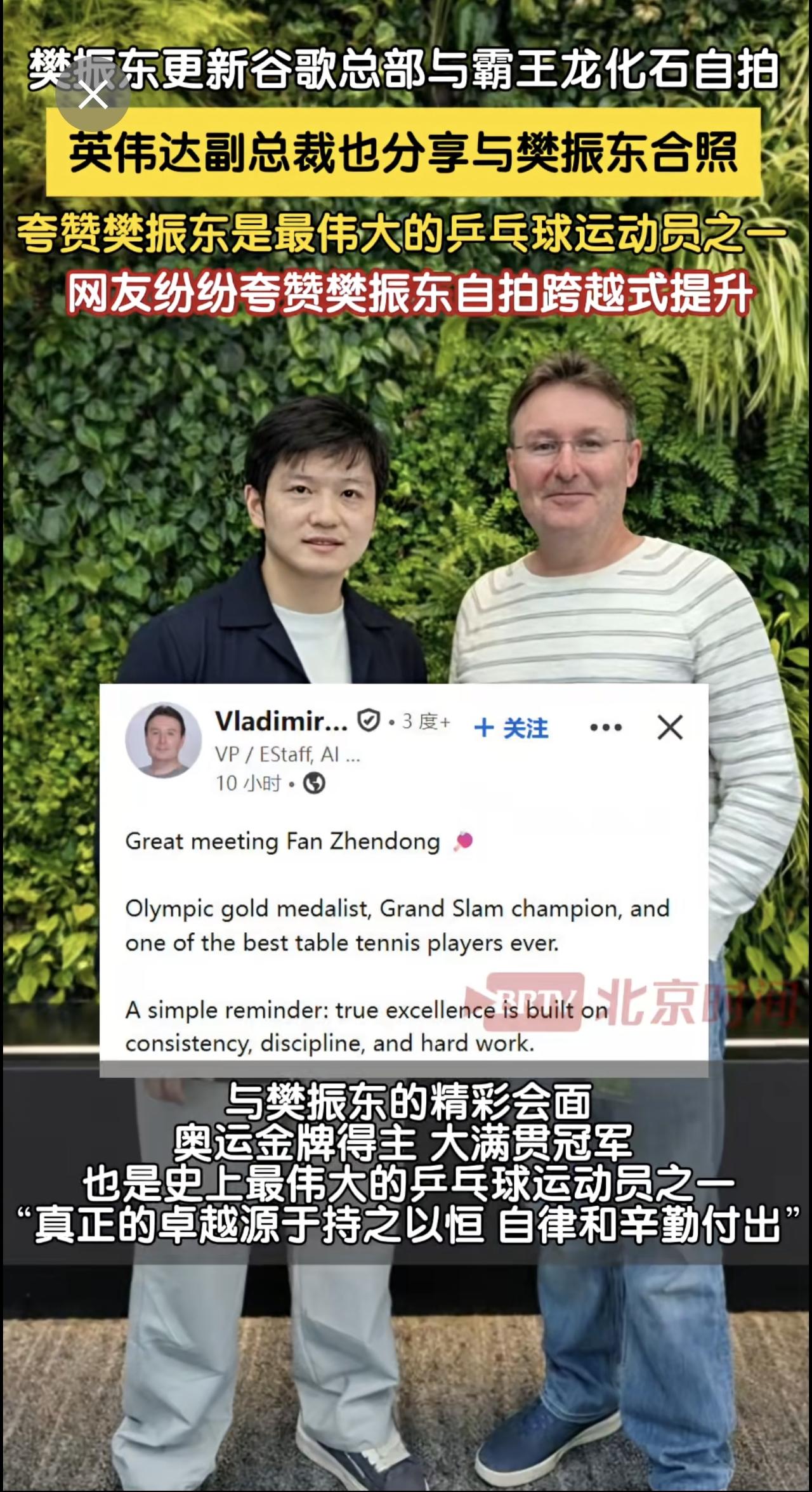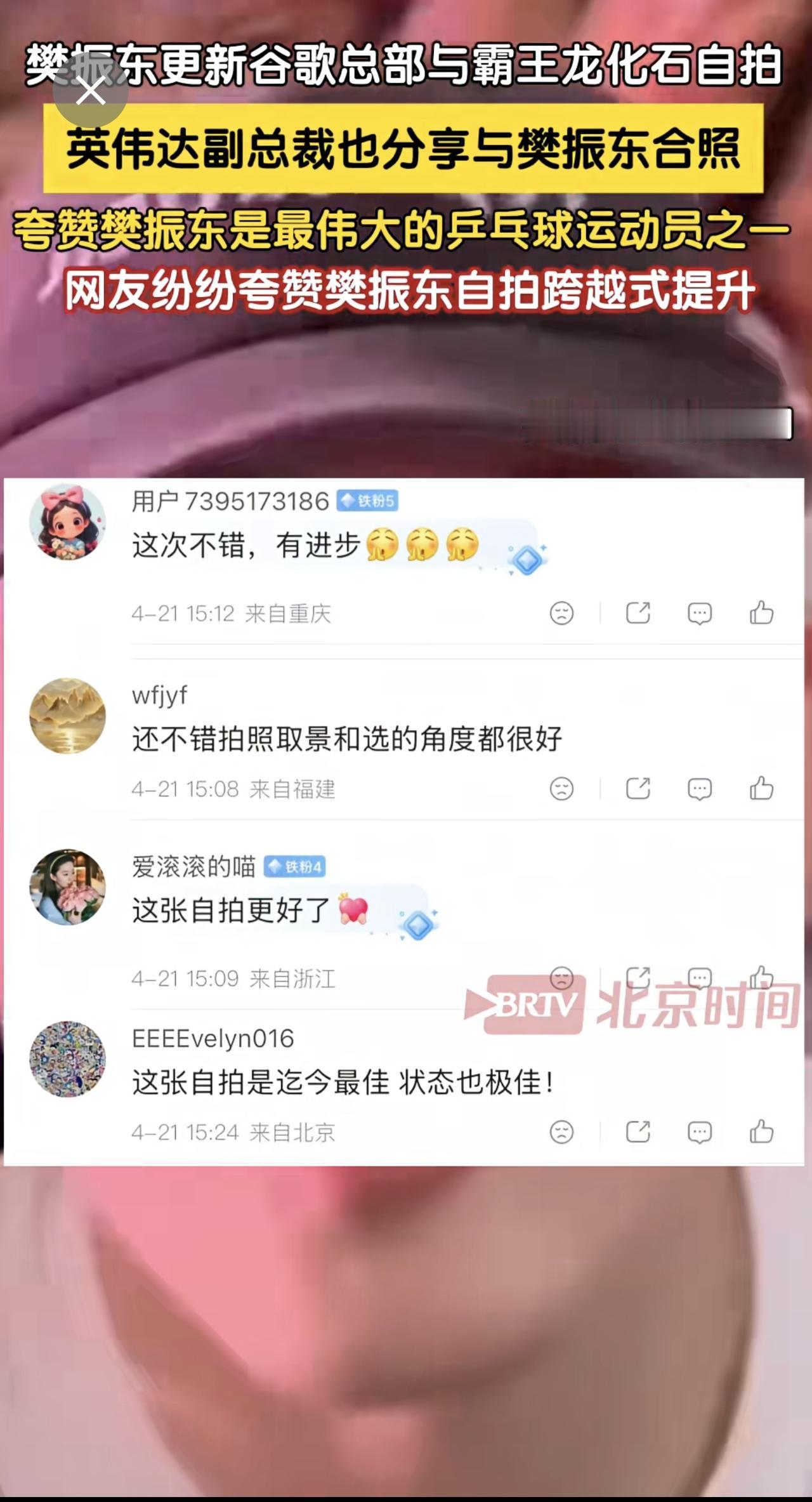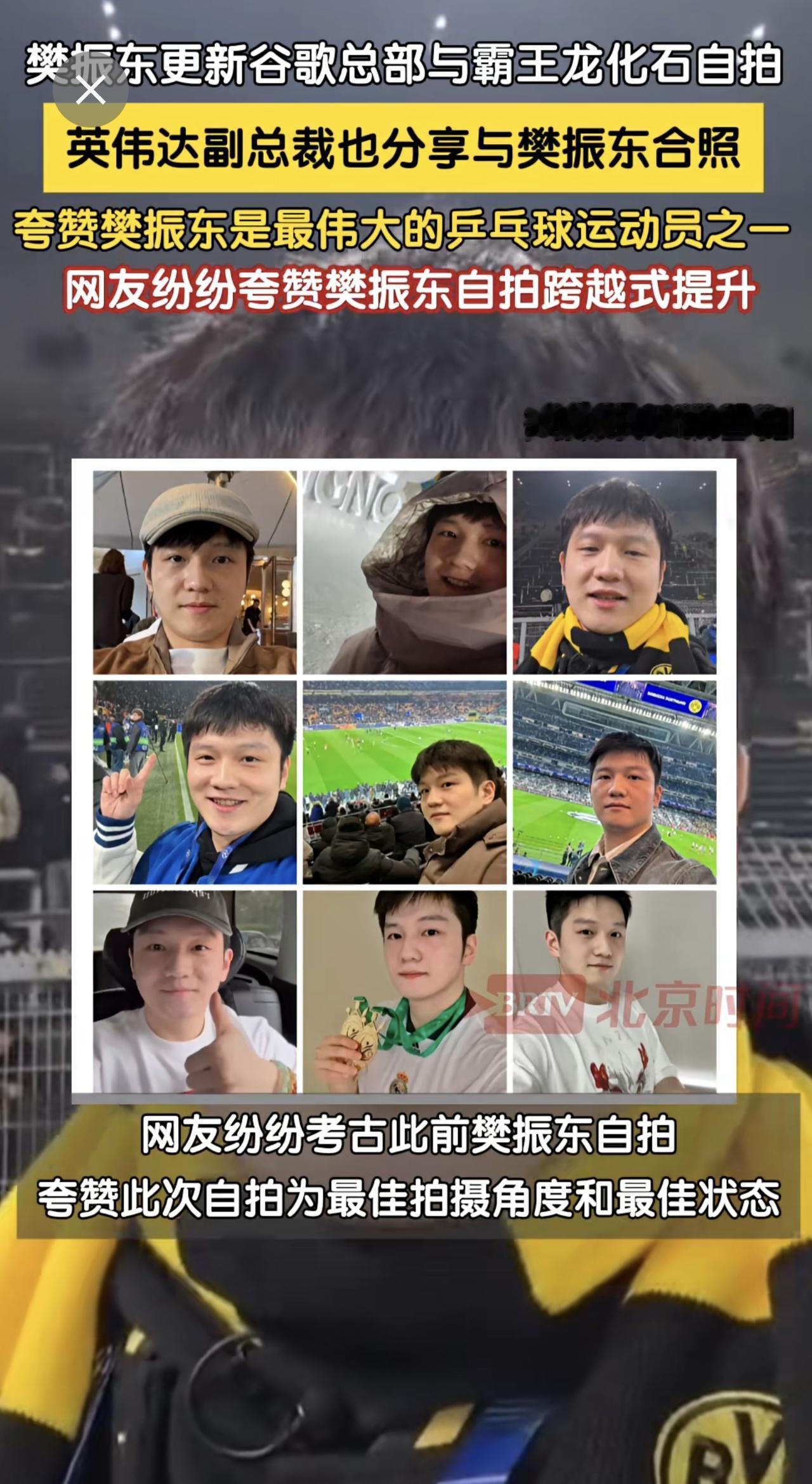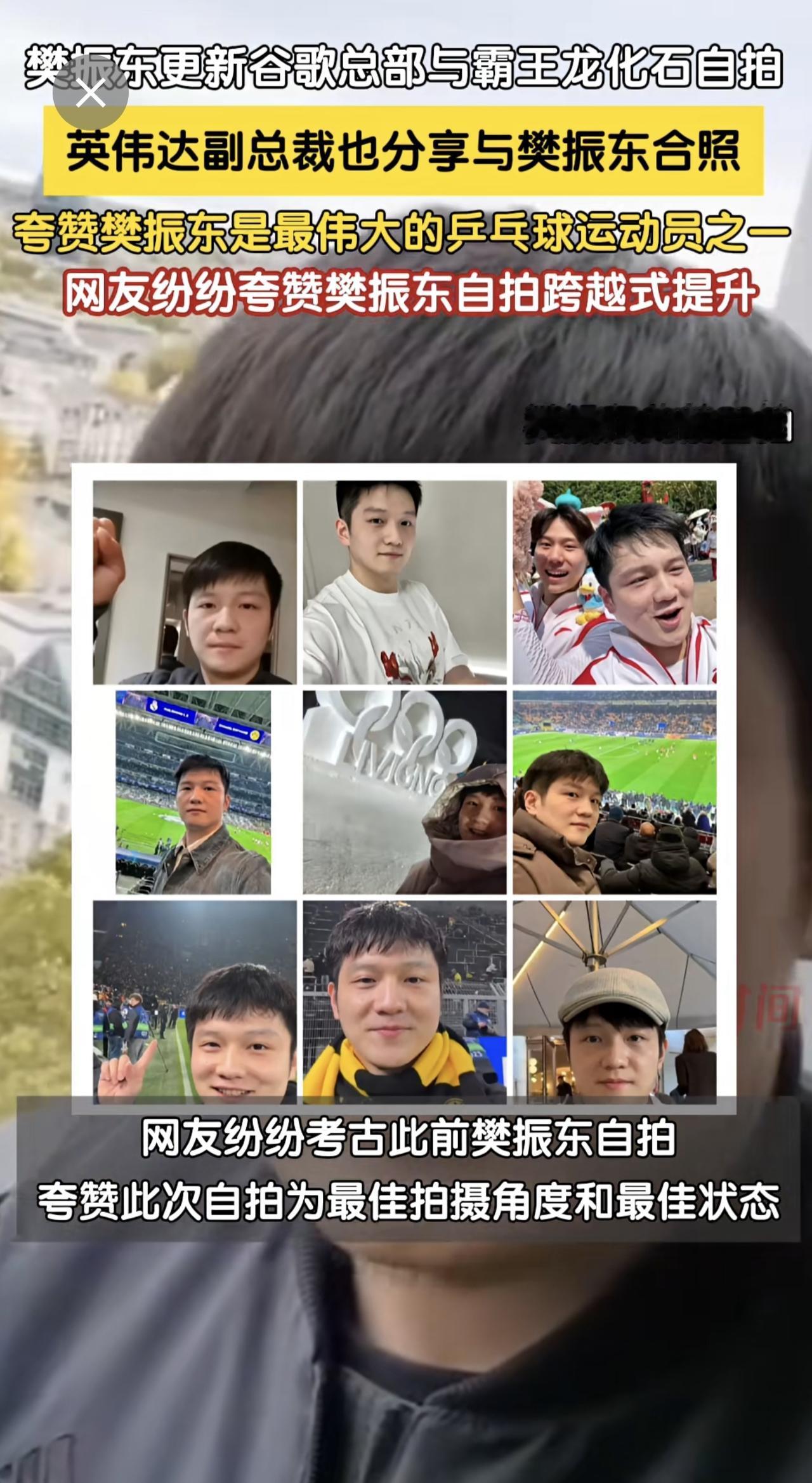 4月21日,樊振东更新社媒在美国加州谷歌总部与霸王龙化石自拍。近日樊振东参观谷歌、英伟达及youtube等大厂。英伟达副总裁随即在社媒更新与樊振东合照,夸赞樊振东是最伟大的乒乓球运动员之一。网友纷纷留言夸赞樊振东,无论是取景角度还是人物状态,其自拍技术有跨越式的提升!