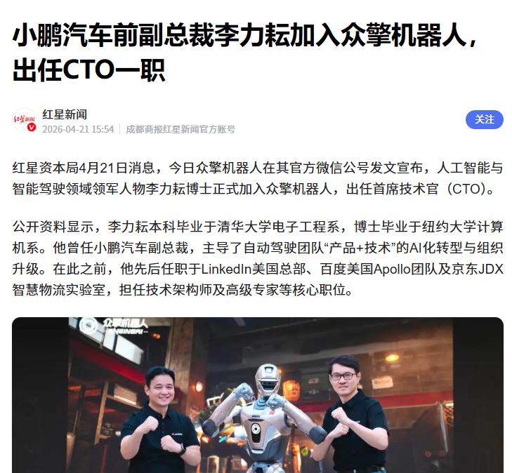 据媒体报道,原小鹏汽车副总裁李力耘博士,近日正式加入了众擎机器人团队,并将出任首席技术官一职。