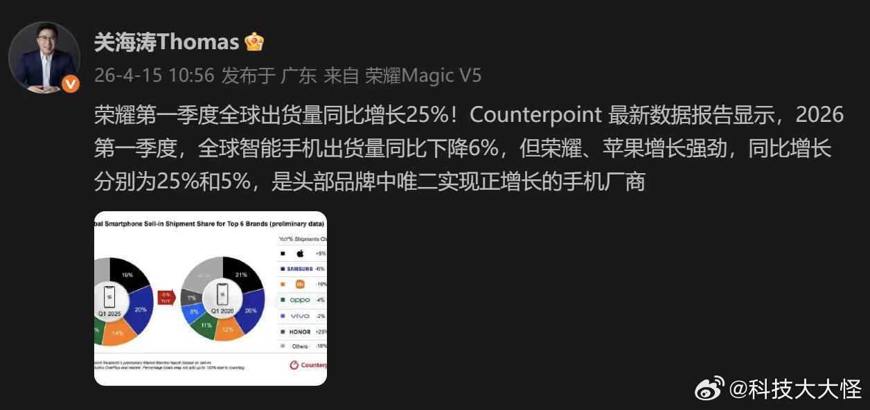 荣耀能在全球市场逆势增长25%,归根结底还是产品力说话。Counterpoint提到的"因地制宜的产品组合",就是荣耀最核心的竞争力之一。从高端的Magic系列、折叠屏V系列,到中端的数字系列、X系列,再到入门的Play系列,荣耀构建了覆盖全价位段的完整产品矩阵。而且它不是简单地把国内机型拿到海外卖,而是针对不同市场做了深度定制。比如在拉美市场主打高性价比机型,在欧洲市场重点推折叠屏和旗舰机。再加上自研魔法大模型、鲁班铰链等核心技术的加持,荣耀的产品在全球市场都有很强的竞争力。国产手机出货逆势增长25%