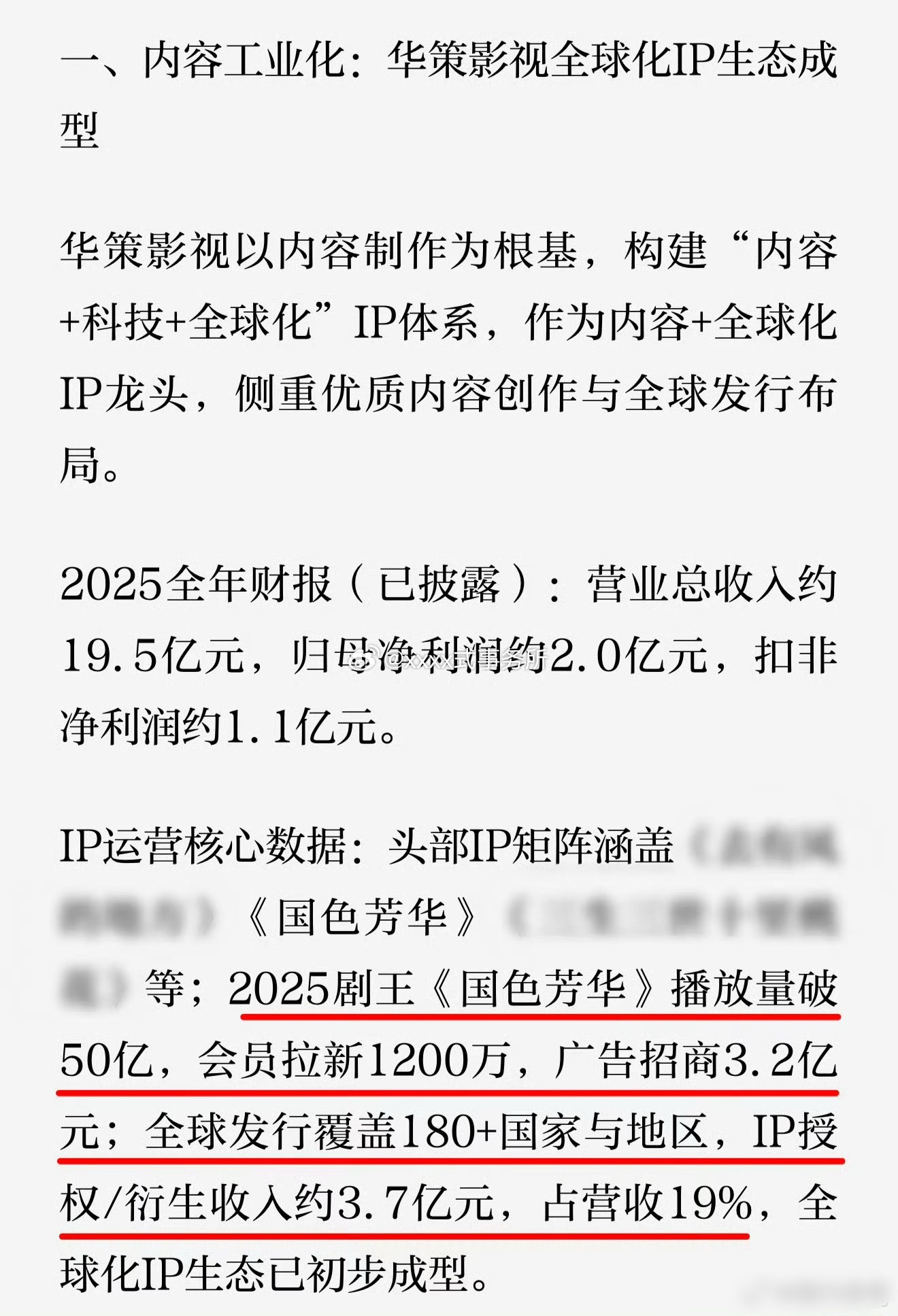 2025剧王杨紫《国色芳华》播放量破50亿,会员拉新1200万,广告招商3.2亿元;全球发行覆盖180+国家与地区,IP授权/衍生收入约3.7亿元,占营收19%这是不是华策官方发的,是的话也太牛了