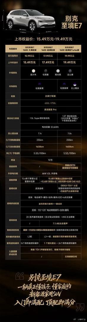 【别克至境E7正式上市】别克至境E7以15.49-19.49万权益价上市即交付,预售破3万单,精准切中成长型家庭痛点。以儿童需求为核心,打造五恒健康座舱与全方位安全防护,兼顾舒适与守护。大五座空间宽松实用,混动系统续航扎实,智能配置全面进阶,没有明显短板。大v聊车