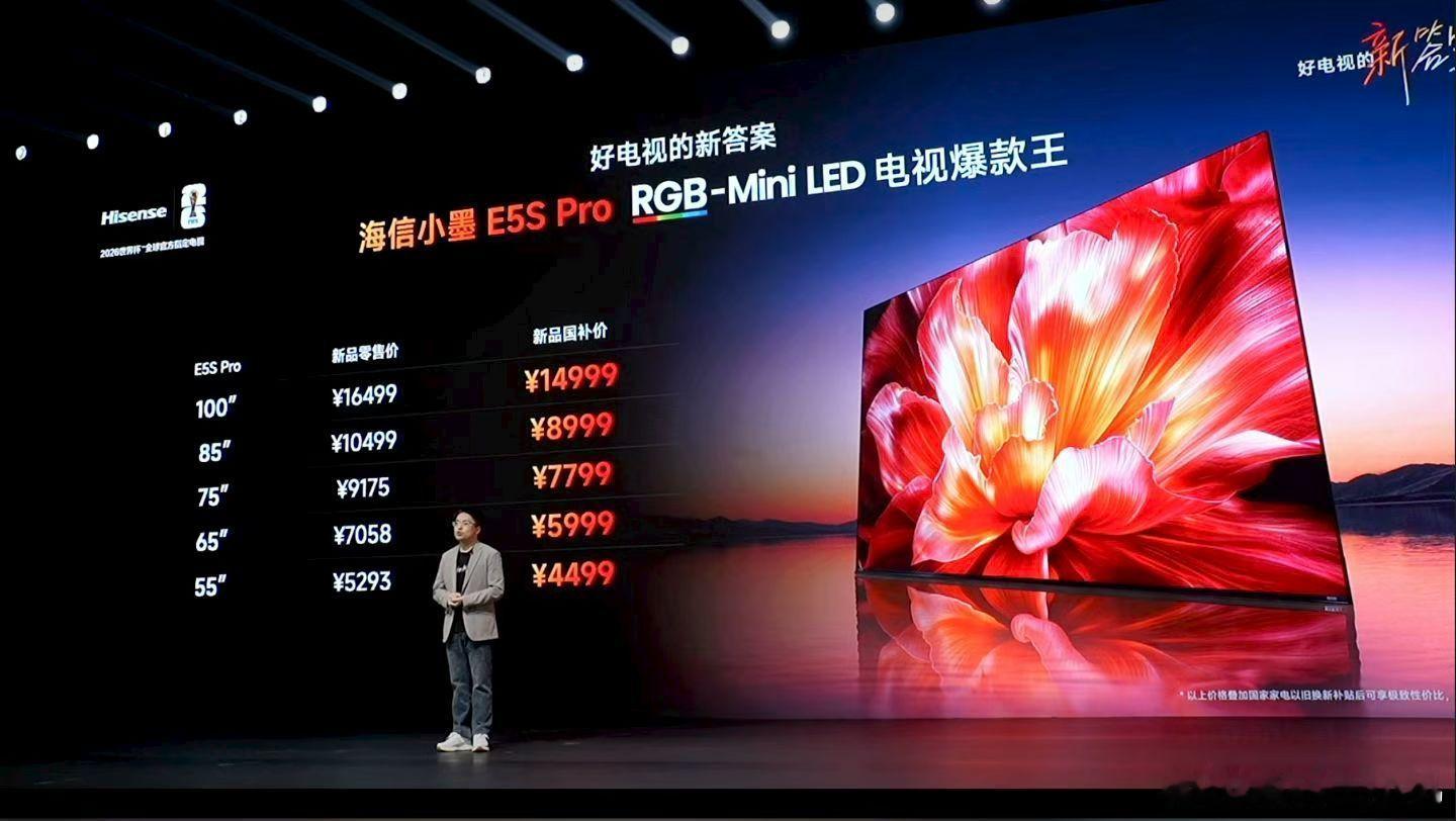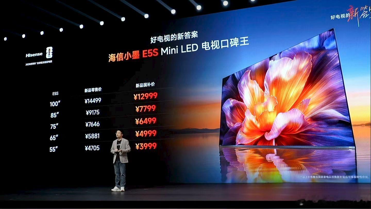 电视换代,就选海信RGB-Mini LED,海信小墨E5双明星系列正式上市!Mini LED电视口碑王小墨E5S起售价3999元,RGB-Mini LED电视爆款王小墨E5S Pro起售价4499元,还有拼手速、抢限时、放心买、省心用等诸多首发顶格权益。海信小墨E5S系列 好电视的新答案