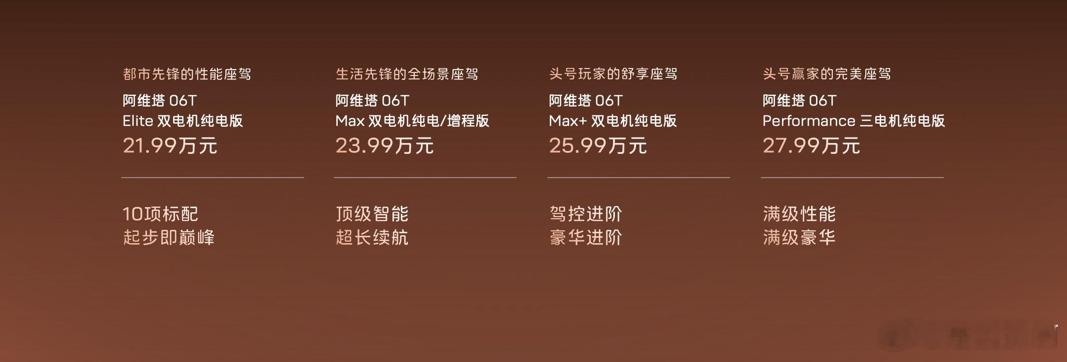 阿维塔06T,应该是目前30万以内能够买到的性能最猛、原创设计最特别的旅行车。而且这次增程只给了一个版型,其他都是纯电版本。全系标配华为乾崑智驾和鸿蒙智舱,顶配甚至就给了三电机,价格还不到28万。