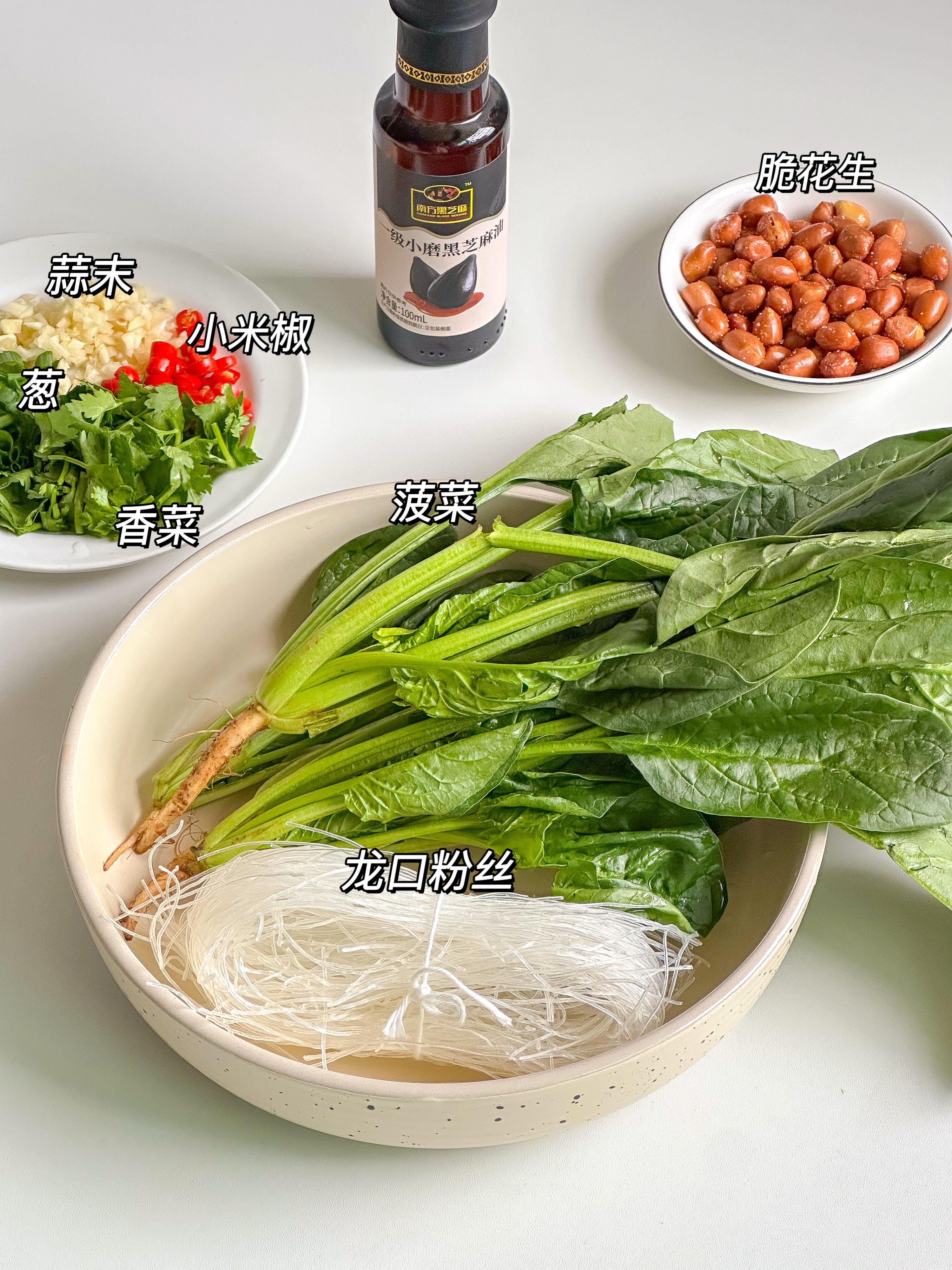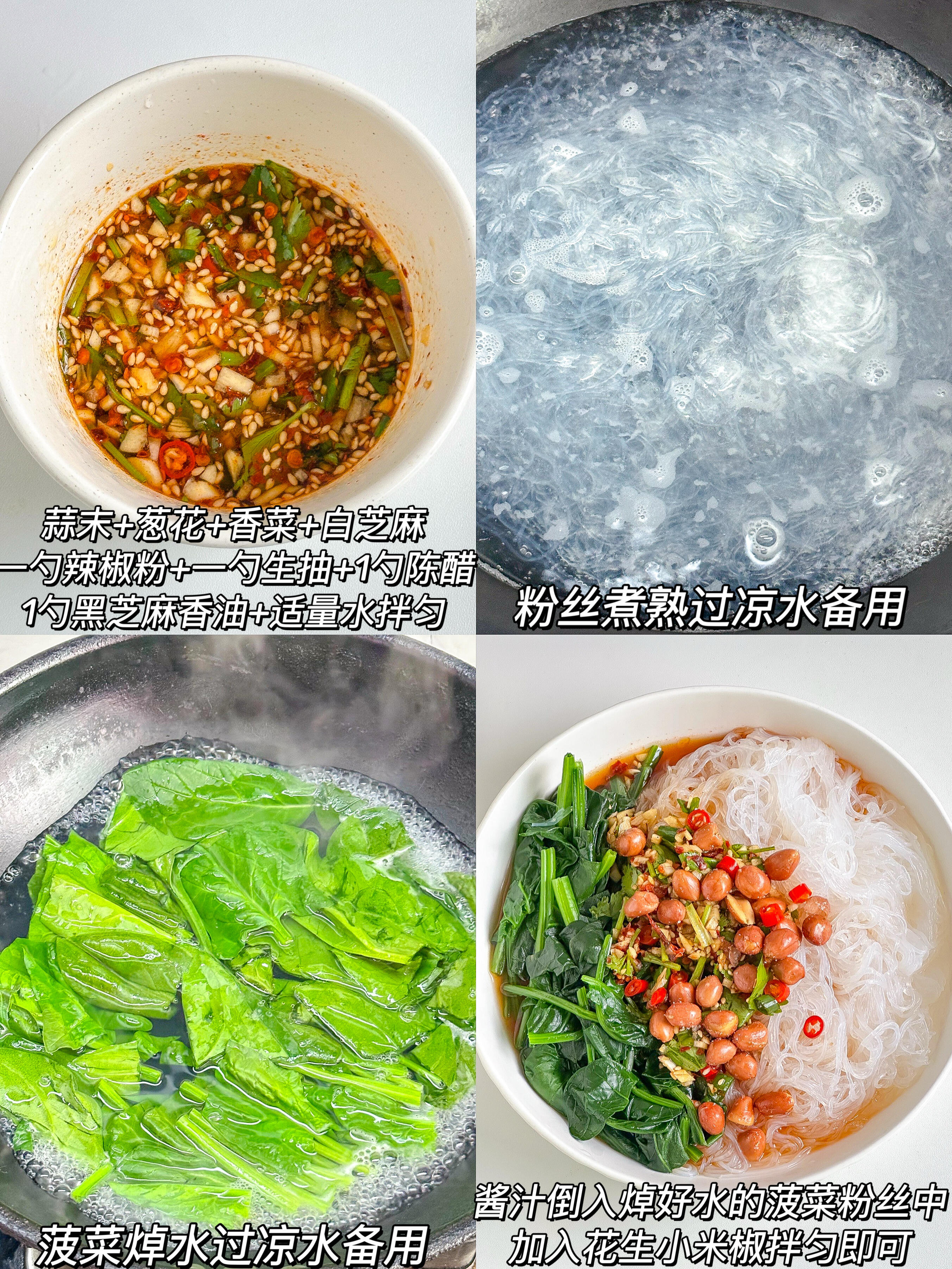 菠菜一把、粉丝一捆、花生、小米椒、蒜末、葱花、香菜