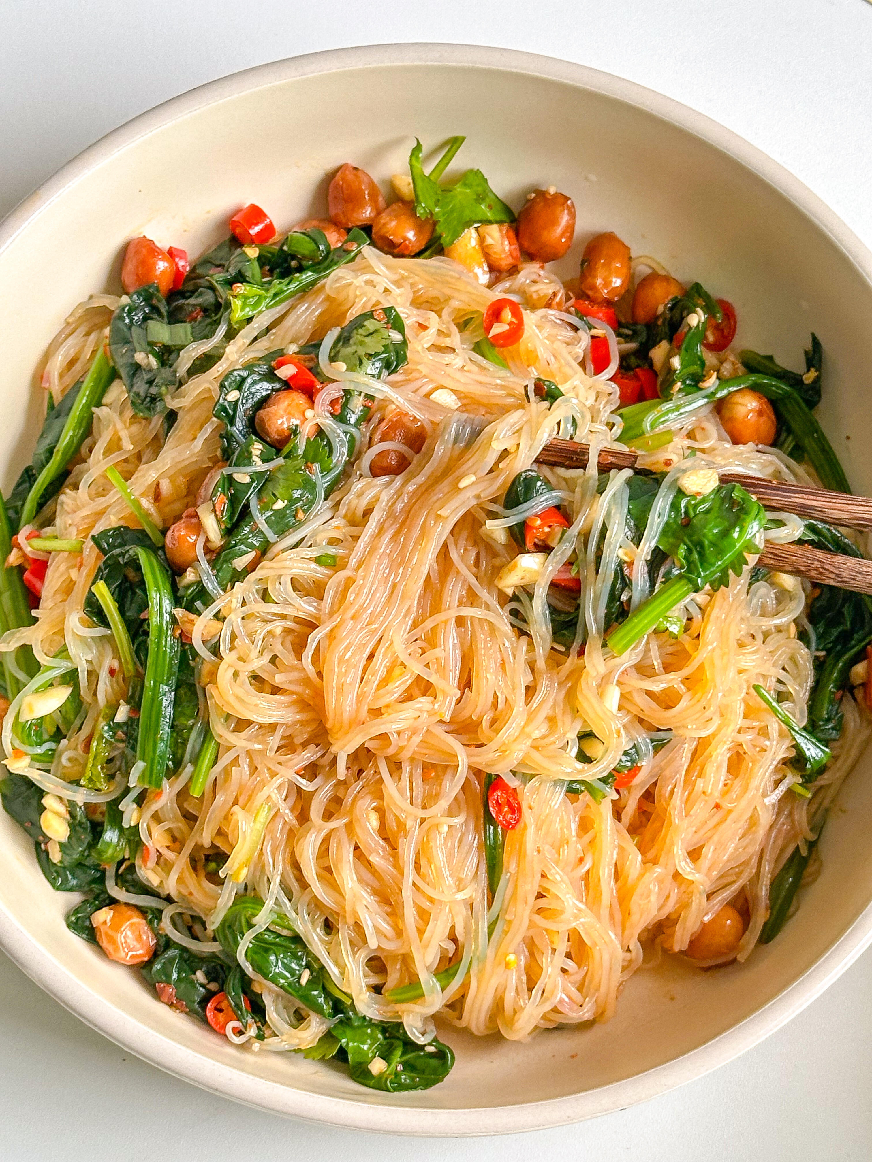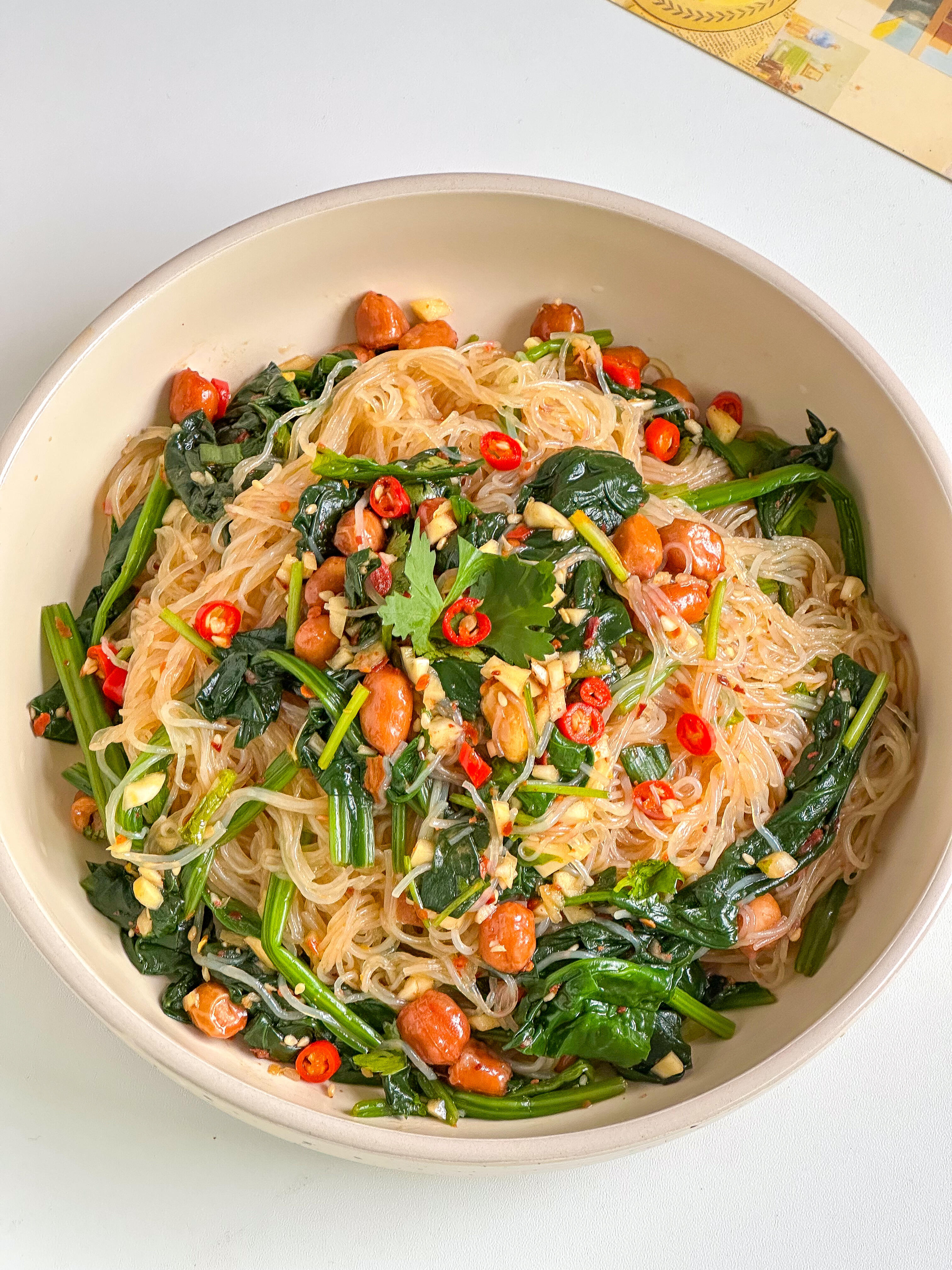 3️⃣ 把调好的酱汁,均匀倒入焯好水的菠菜和粉丝中,再加入花生,用筷子充分拌匀,让每根粉丝、每片菠菜都裹满酱汁,直接开吃就好~