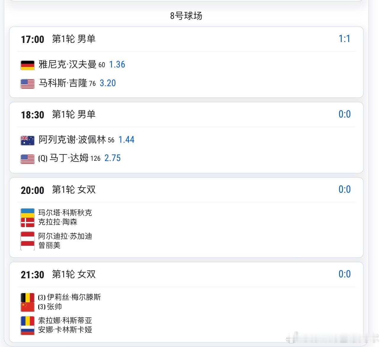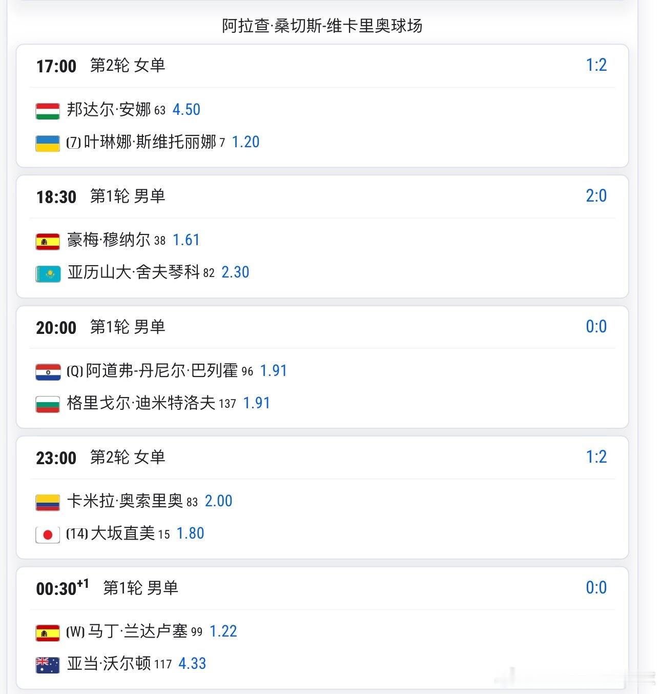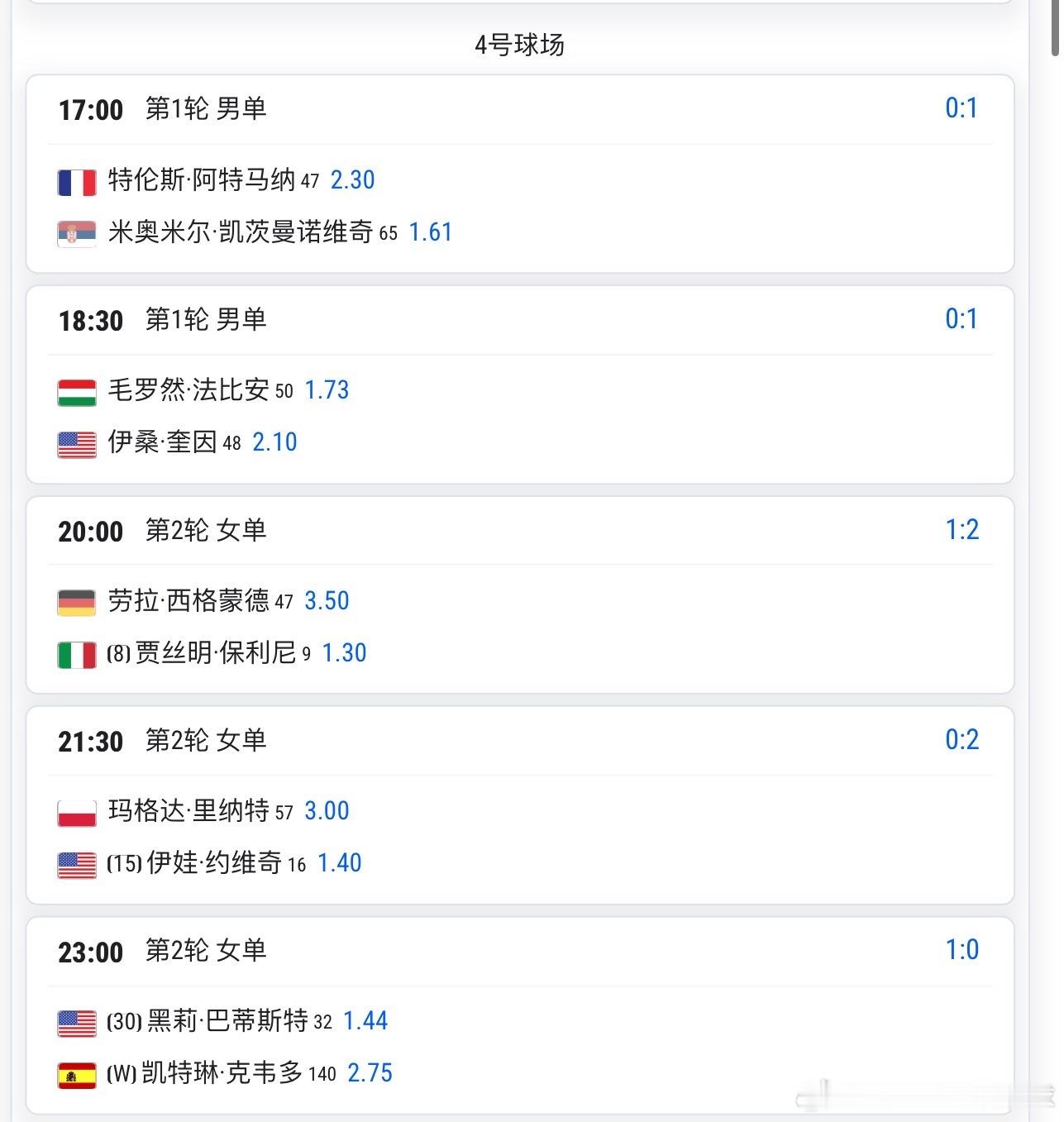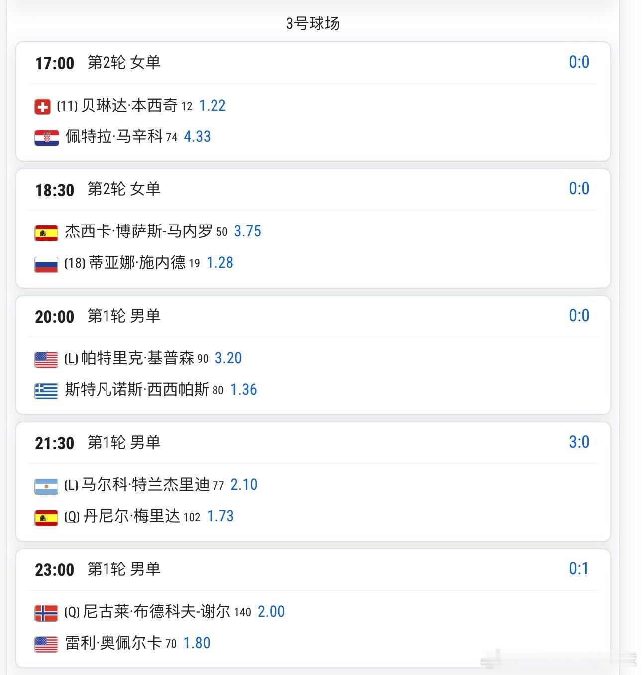 中心场不早于19点斯瓦泰克🇵🇱vs斯尼古尔🇺🇦20:30萨巴伦卡🇧🇾vs斯特恩斯🇺🇸