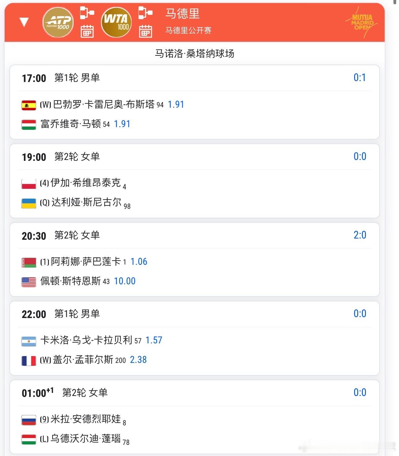 4.23日马德里赛程 萨巴伦卡,王欣瑜出战