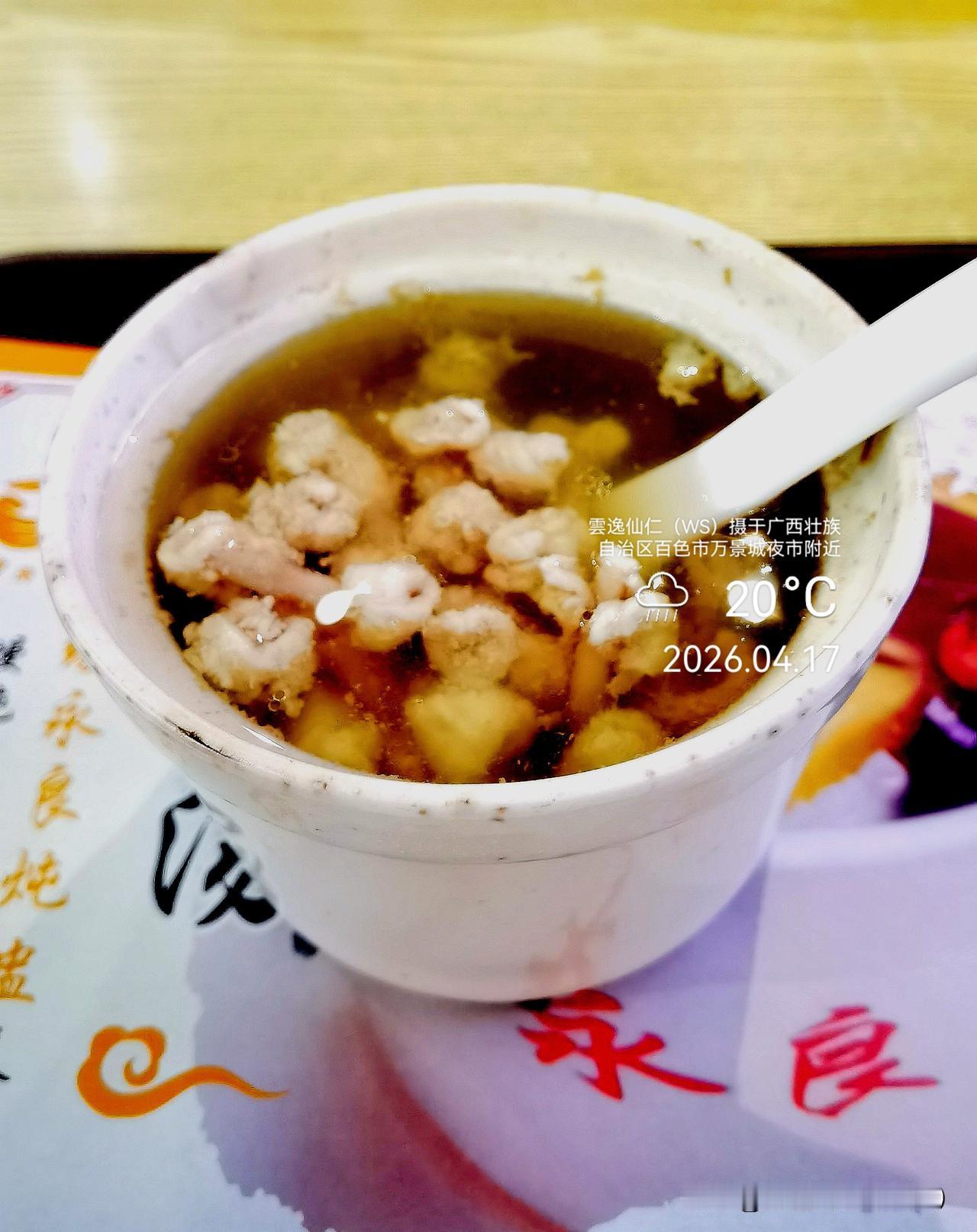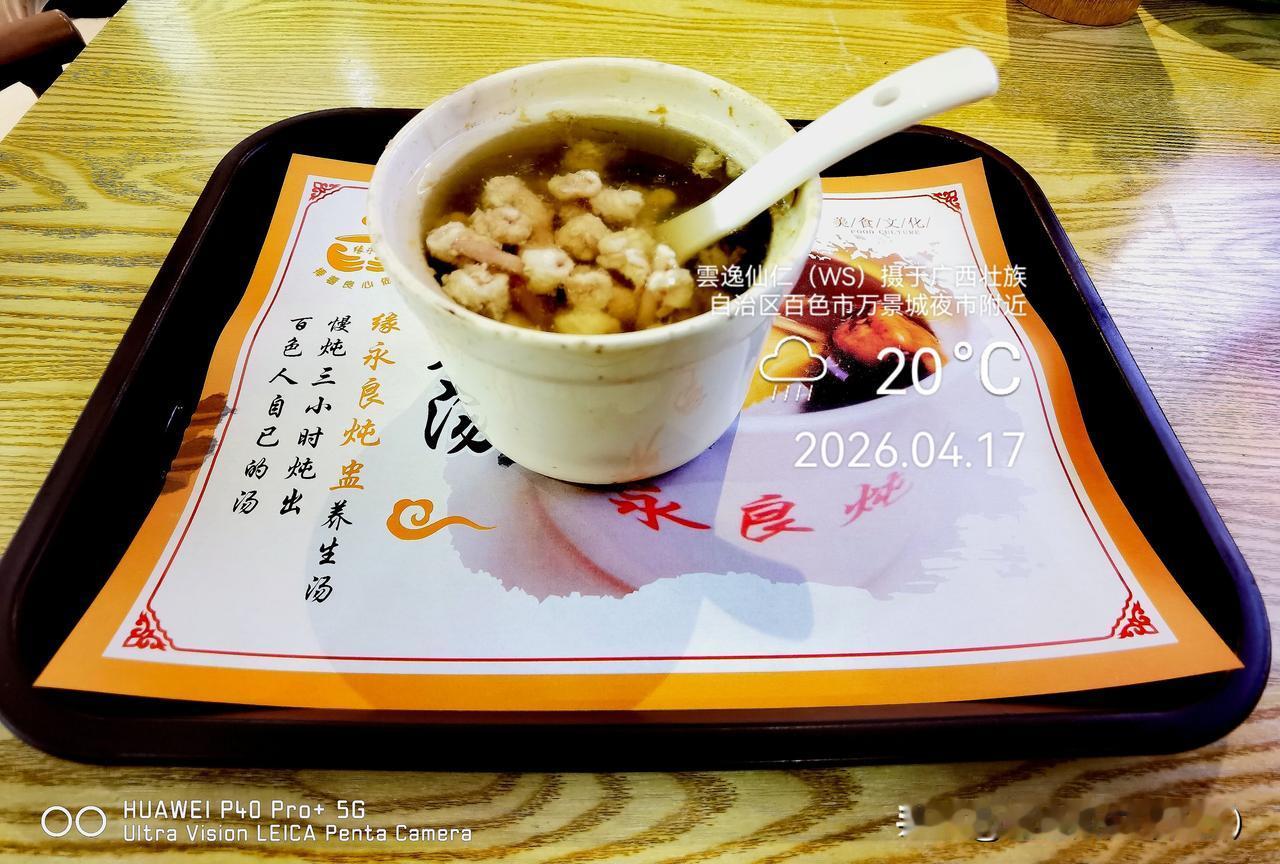 旅居生活记录(9542)广西壮族自治区百色市(228)品尝小吃56:天麻炖骨髓(13元1盅)、新鲜蒲公英凉茶(5元1大杯)、牛肉汤包(2.5元1个)。