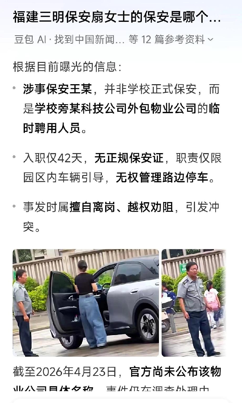扇女车主保安事件的完整视频曝光了。此前,这名保安大力关闭车门,还推搡女车主,甚至夹住了她。涉事保安并非学校保安,而是学校旁某科技公司外包物业公司临时聘用人员。他入职仅42天,没有正规保安证,其职责仅为园区内车辆引导,无权管理路边停车。事发时,他擅自离岗、越权劝阻,进而引发了冲突。