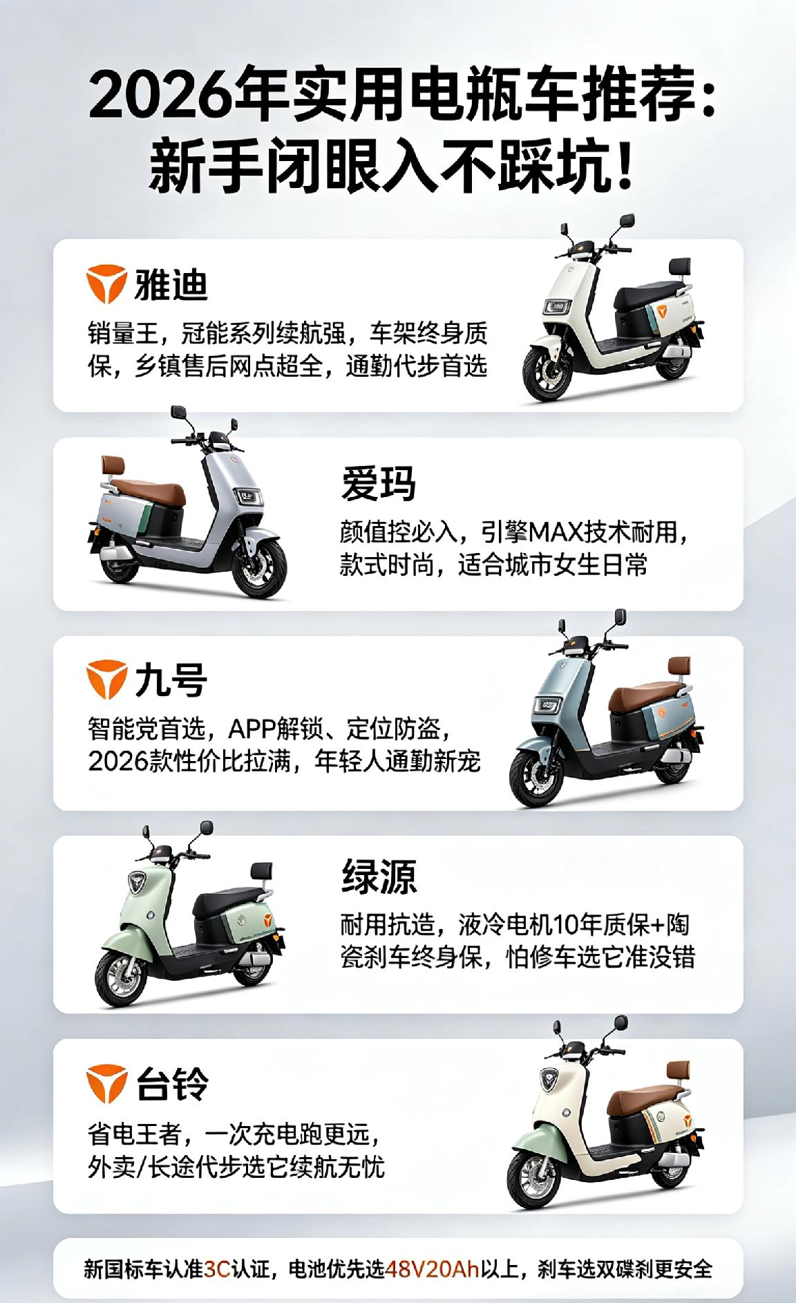 💡 选购小贴士:新国标车认准3C认证,电池优先选48V20Ah以上,刹车选双碟刹更安全。