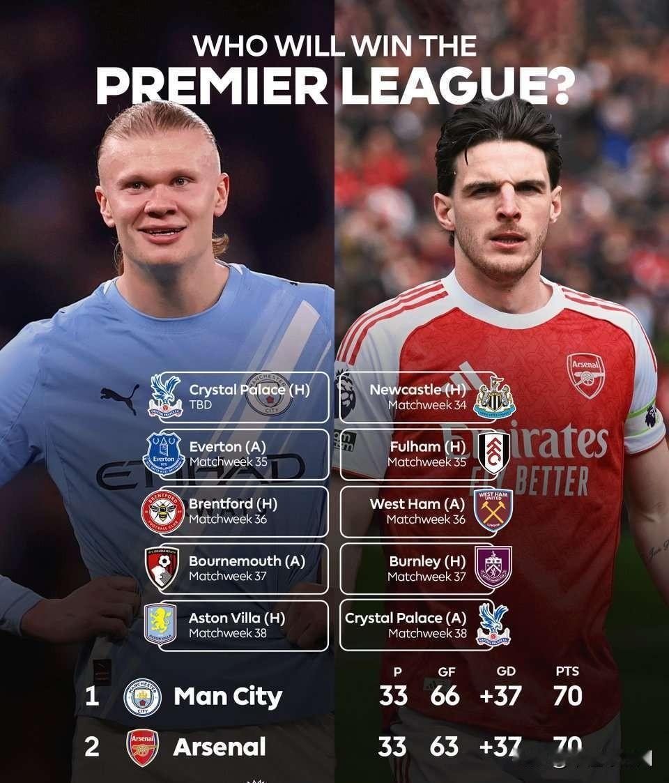 看两队剩余比赛的形势,阿森纳有点危险,在英超比赛中,两队后期的对手都不是太难打。曼城有足总杯比赛,过了南安普顿之后就是切尔西或者利兹联。