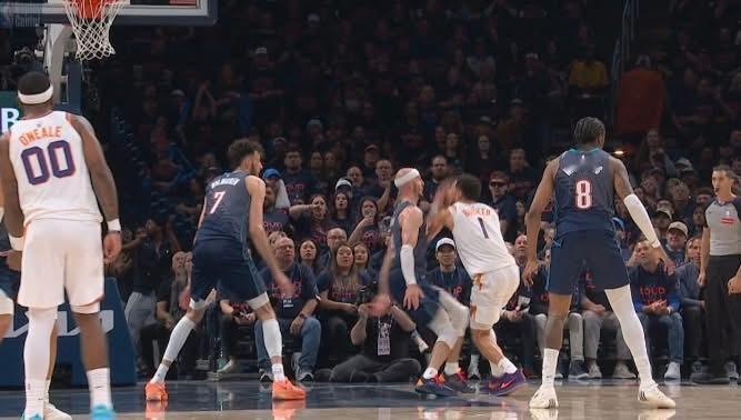咁都算啦,第三節尾段,DB飛身救波,個波打中積連威廉士(Jaylin Williams),球證即刻吹雞,OK,以為吹J-Will犯規,係就係犯規,但送多個T畀迪雲保加(Devin Booker),大家可以睇下片,連旁述都呆咗,整個網上世界無人知道發生咩事。