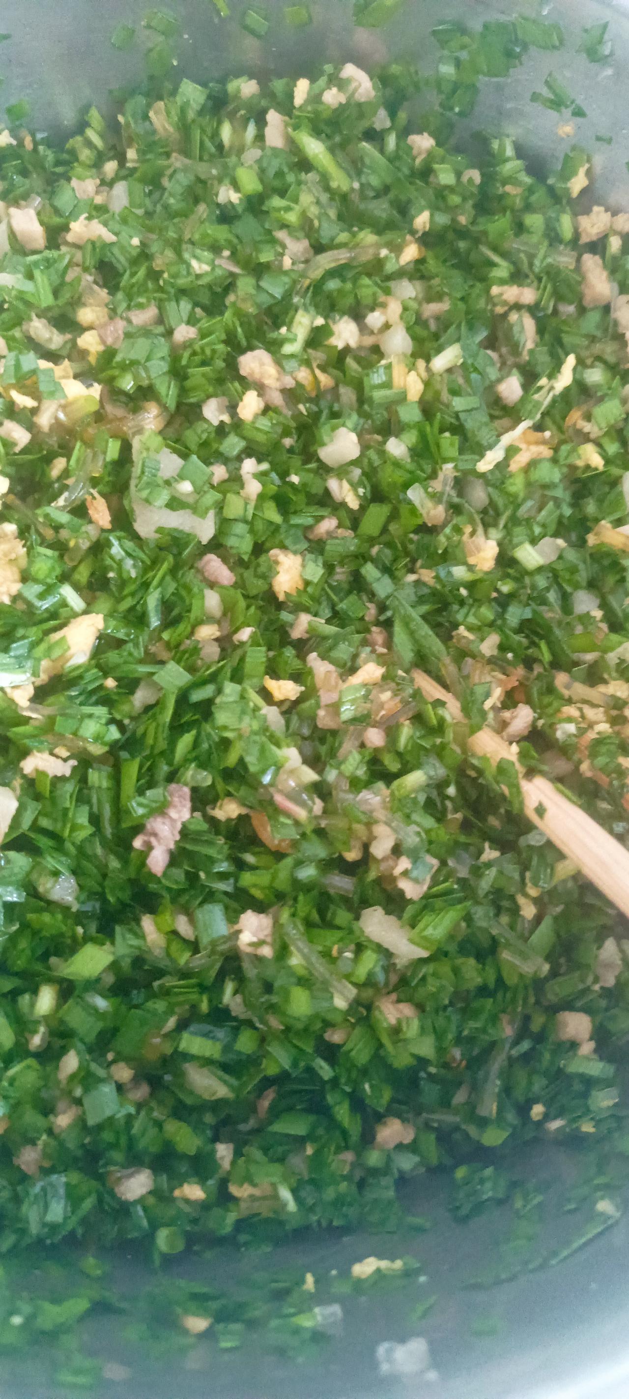 再煎两个笨鸡蛋,焯粉条,剁碎,放到饺馅里。